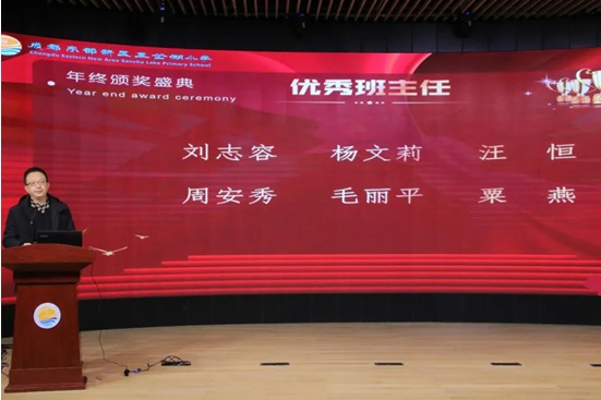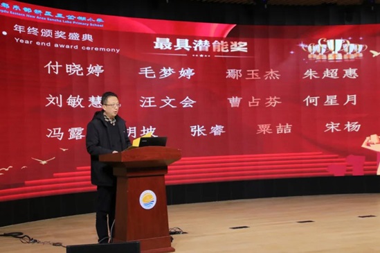 然后,副校长郭勇主持了颁奖盛典,宣读事迹材料和获奖名单,共有55名老师分别获得三岔湖小学最具潜力奖、优秀青年教师、敬业奉献奖、优秀指导教师、优秀班主任、2020感动校园人物。