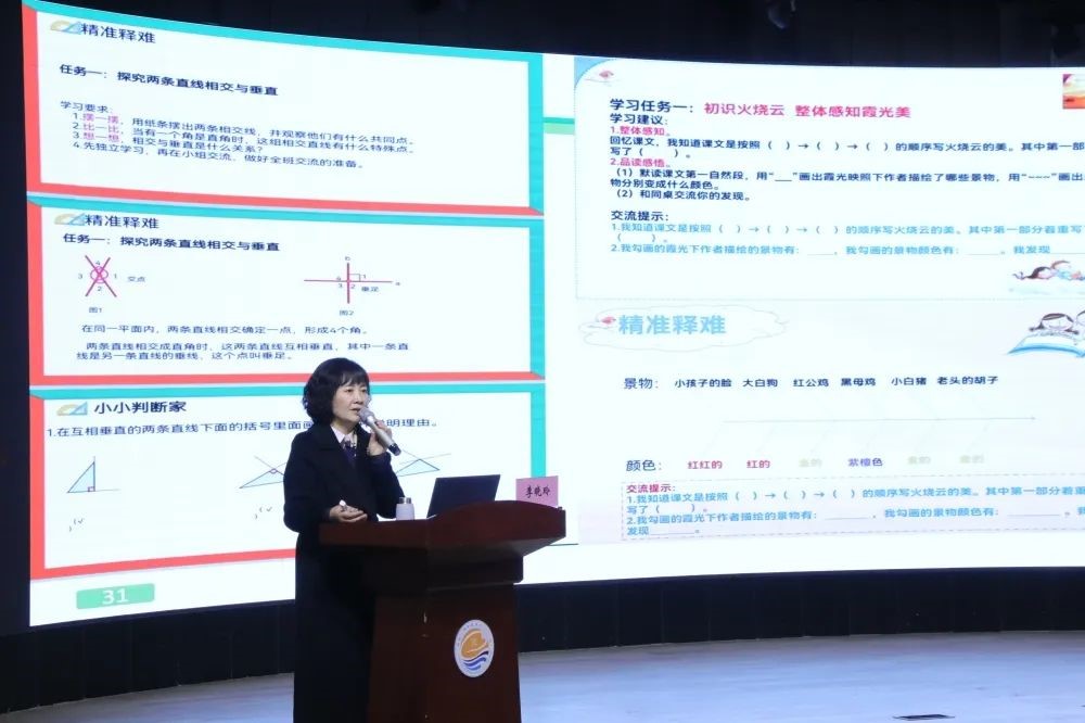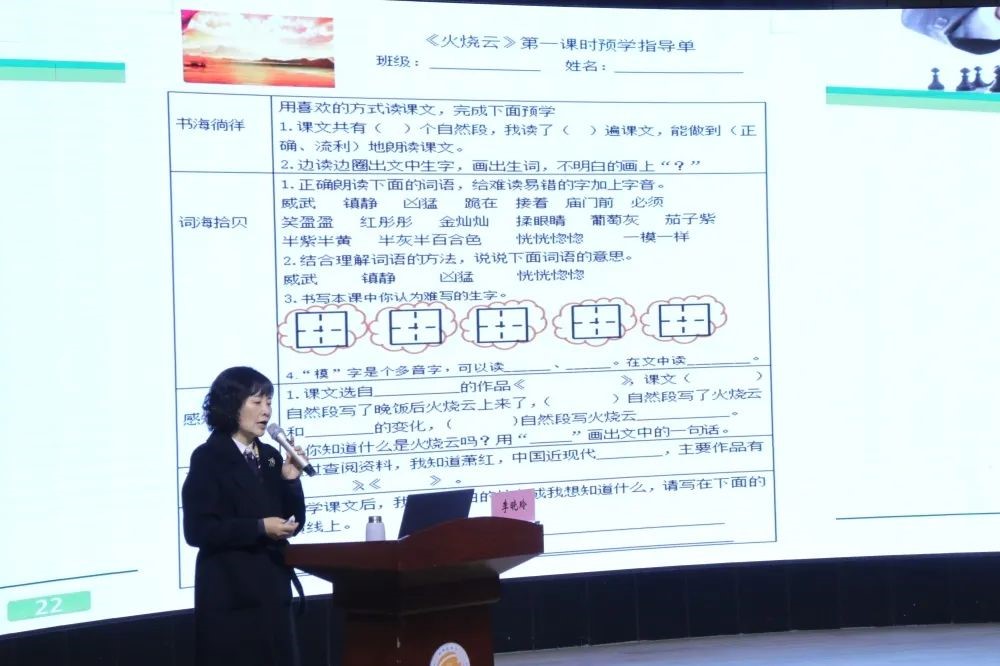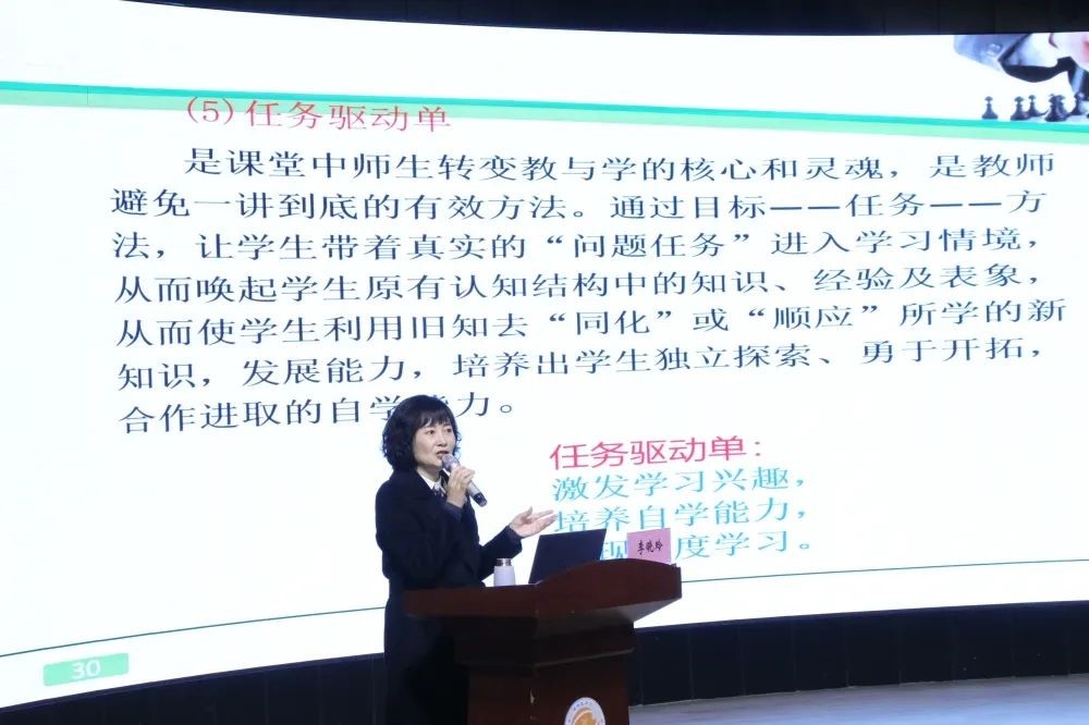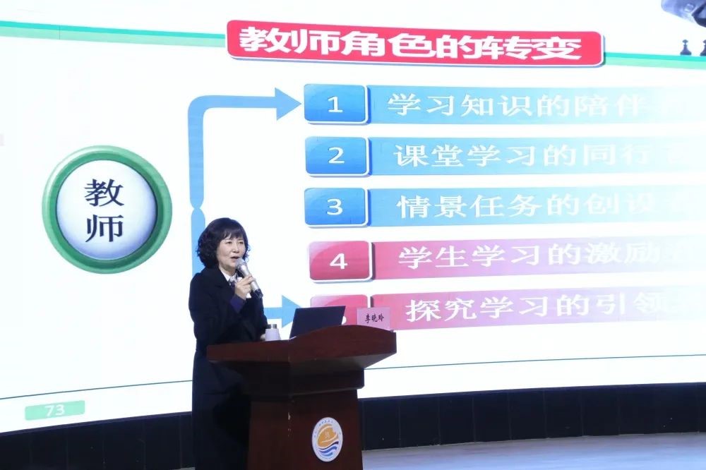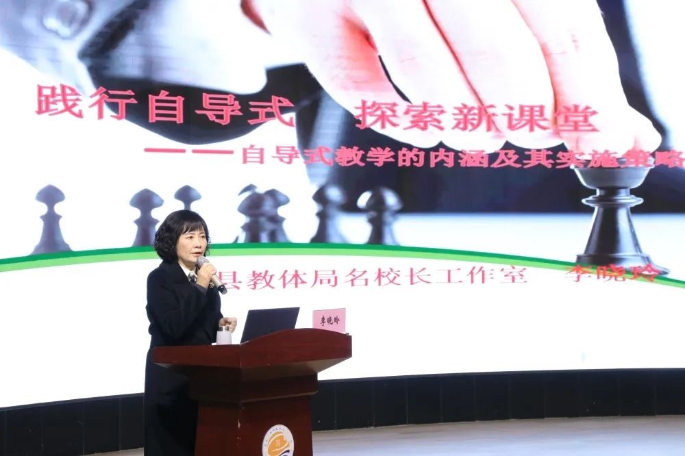 李校长以《践行自导式,探索新课堂——自导式教学的内涵及其实施策略》为题,结合工作室团队“自导式”教学实践历程,理论联系实际,就新课改下“自导式”教学的含义、内涵、特征、开展流程等进行了解读,重点就“自导式”教学“一案四单”的研制和运用、“三段九环”的课堂教学结构的设计进行了详细的讲解。