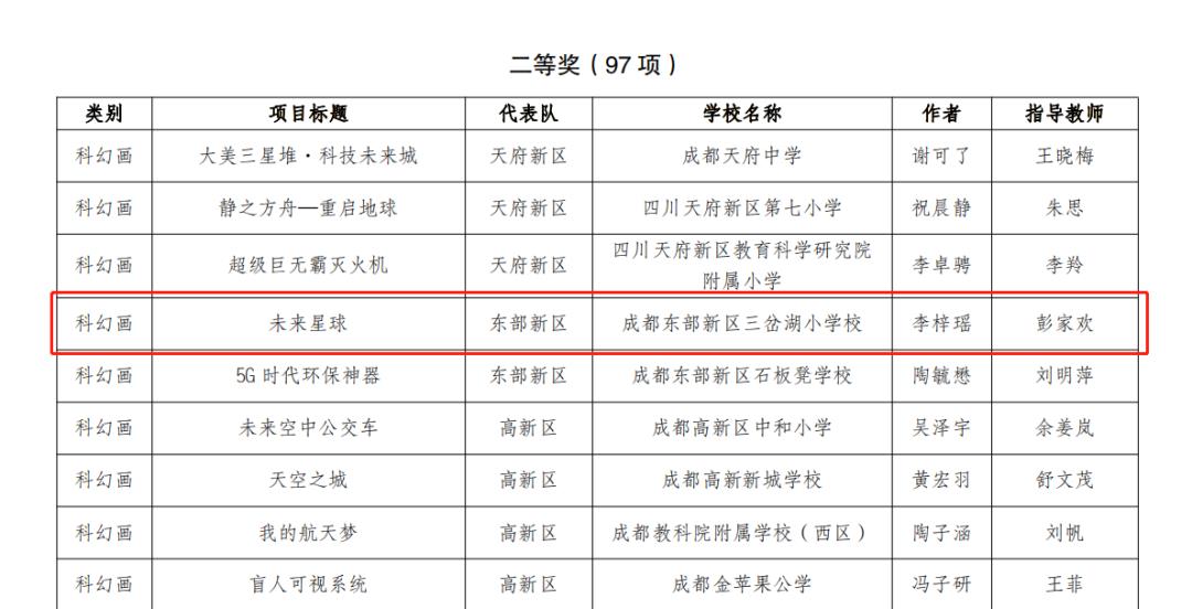 科技点亮未来,创新改变生活。为进一步培养青少年的创新精神和实践能力,促进青少年科技创新活动成果展示交流,激发青少年科创兴趣。2022年9月,我校组织师生参加了成都市第38届科技创新大赛,本次大赛是由市科协、市教育局、市科技局和团市委共同主办的科技综合性赛事。近日,大赛组委会传来捷报,我校斩获科技创新成果(发明类)2个三等奖;科技创新成果(论文)1个二等奖;科学幻想绘画1个二等奖;学校也被评为成都市“优秀组织学校”。