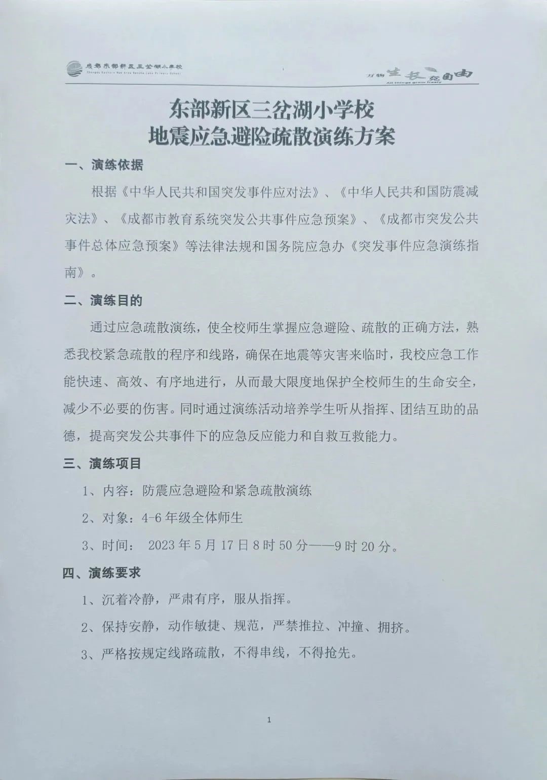 近年来,我国地震频繁发生,造成了严重的生命财产损失,加强地震预防演练是保护师生生命财产的重要措施。为了进一步加强学校安全工作,增强学校师生防震逃生安全意识,提高自救防范能力,做到在发生地震时,能临危不乱,有序、迅速地按照逃生路线安全疏散,确保全体师生的生命安全,2023年5月17日上午,我校组织全体师生开展校园防震应急疏散演练。