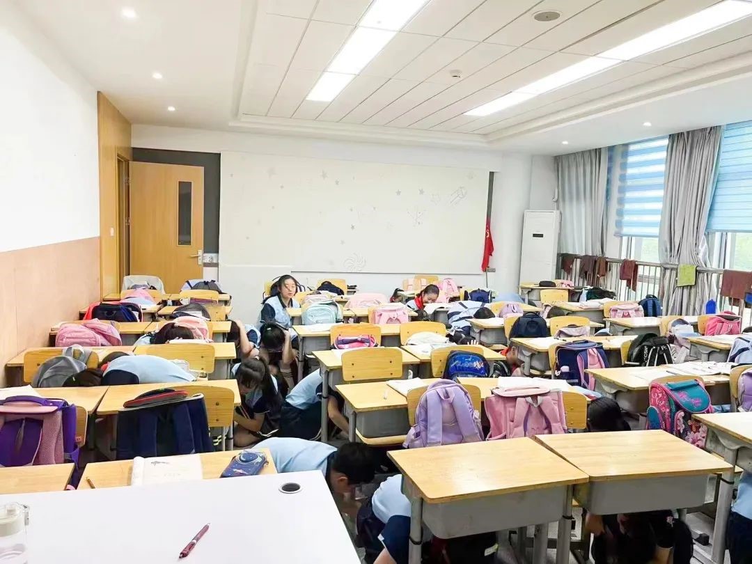 上午8点50分,校内广播响起,安全办涂建主任宣读了本次演练的注意事项。随后当第一声警报声响起,各班教师指挥学生就近躲避,迅速蹲在桌子底下或者是墙角,用双手护住头部。