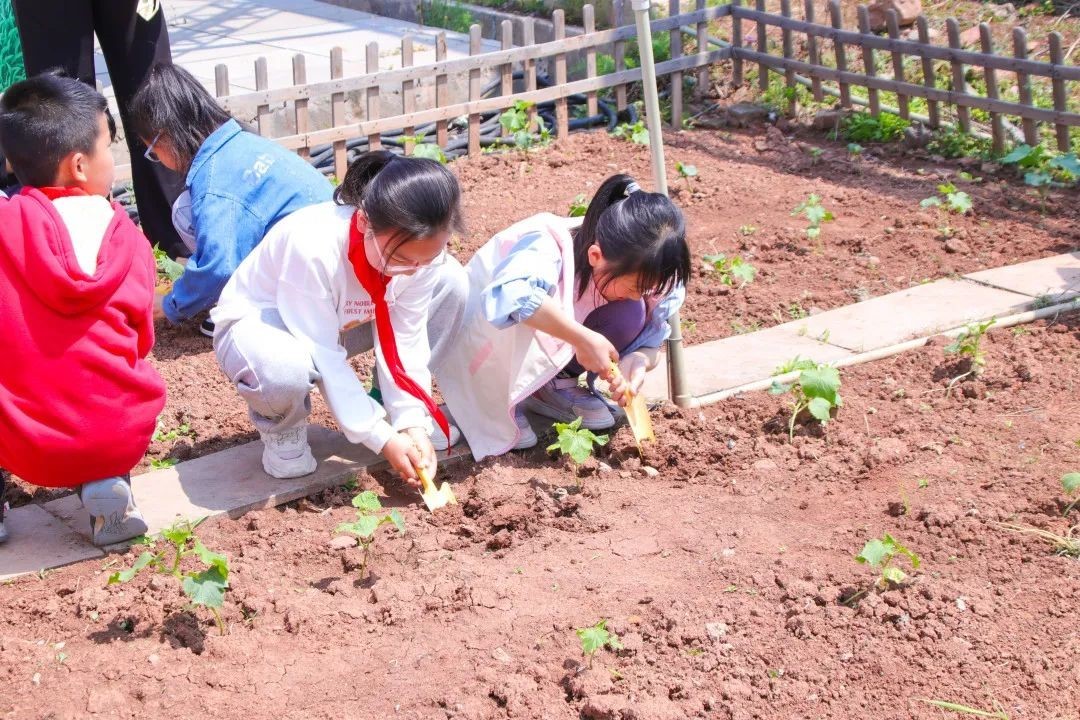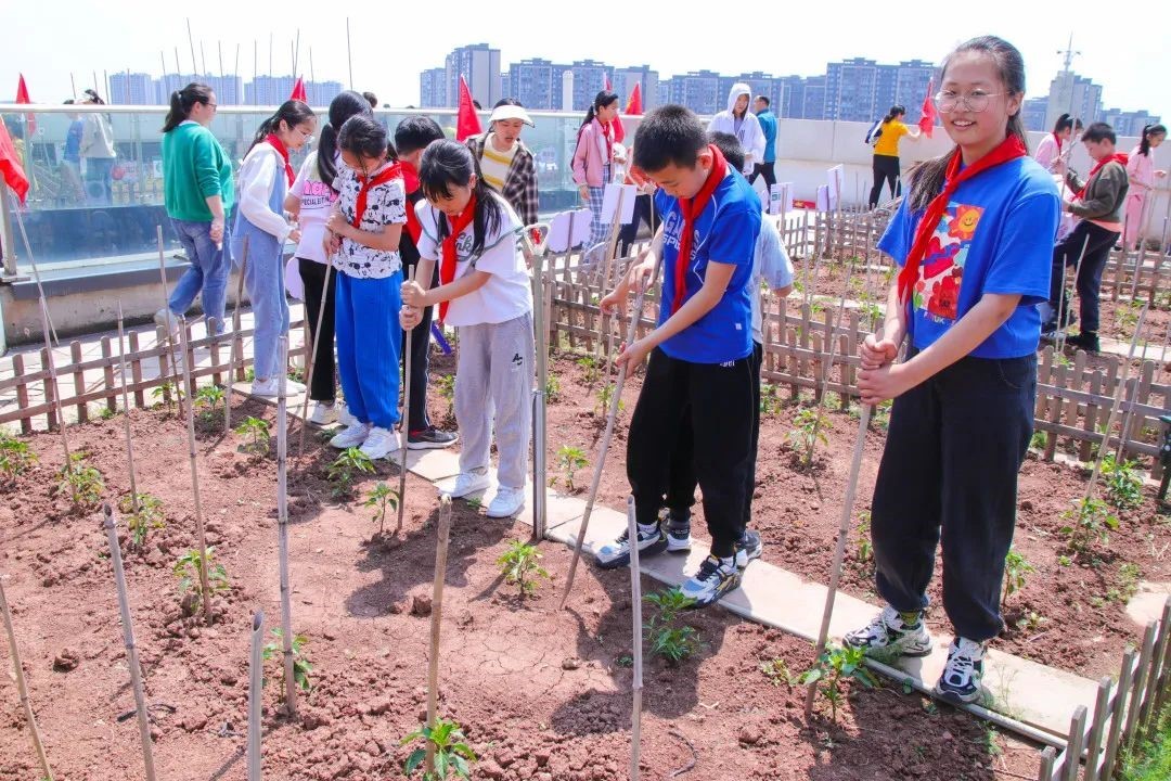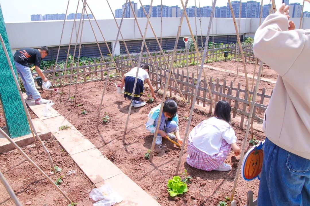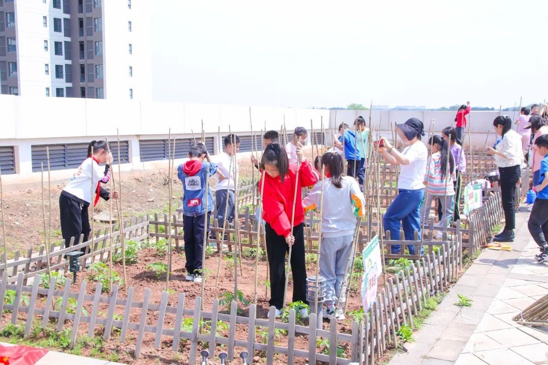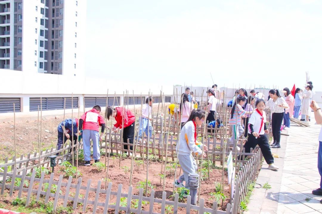 当同学们来到自己班级的责任地,他们开始有序的分工。一些同学认真地进行施肥,他们用小手抓起一把肥料,然后小心翼翼地将肥料散落在每一棵植物周围,确保每一株植物都能得到足够的养分。有的同学负责除草,他们弯下身子,用手拔掉杂草,或者使用铁秋轻轻刨开土壤,清除杂草并保持土地的通气性和透水性,让植物更好地吸收养分。还有一些同学则负责搭建架子,他们拿出事先准备好的材料,然后按照夏老师教的方法使用绳索将材料组装起来,为藤本植物提供支撑和生长的空间。