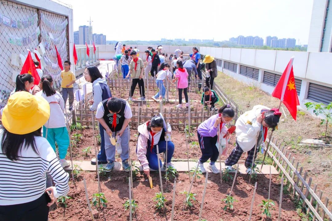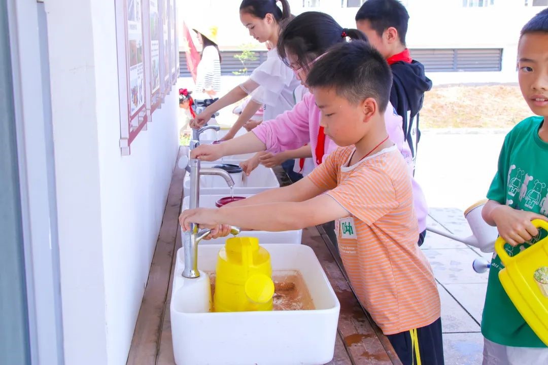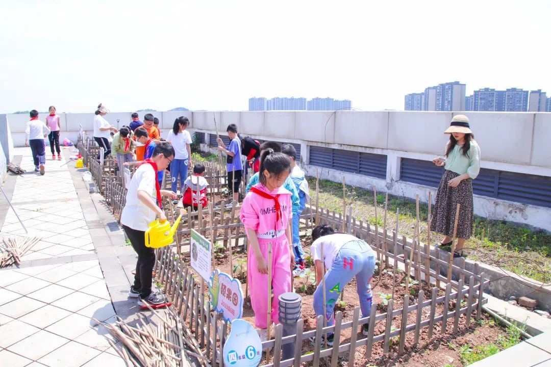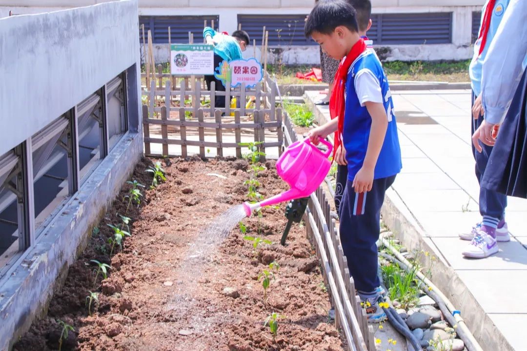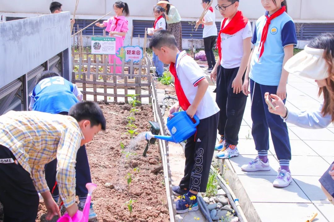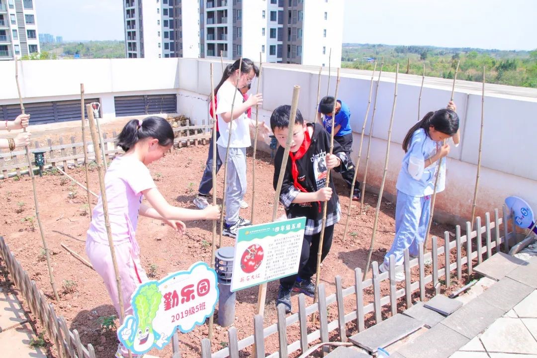 当同学们来到自己班级的责任地,他们开始有序的分工。一些同学认真地进行施肥,他们用小手抓起一把肥料,然后小心翼翼地将肥料散落在每一棵植物周围,确保每一株植物都能得到足够的养分。有的同学负责除草,他们弯下身子,用手拔掉杂草,或者使用铁秋轻轻刨开土壤,清除杂草并保持土地的通气性和透水性,让植物更好地吸收养分。还有一些同学则负责搭建架子,他们拿出事先准备好的材料,然后按照夏老师教的方法使用绳索将材料组装起来,为藤本植物提供支撑和生长的空间。