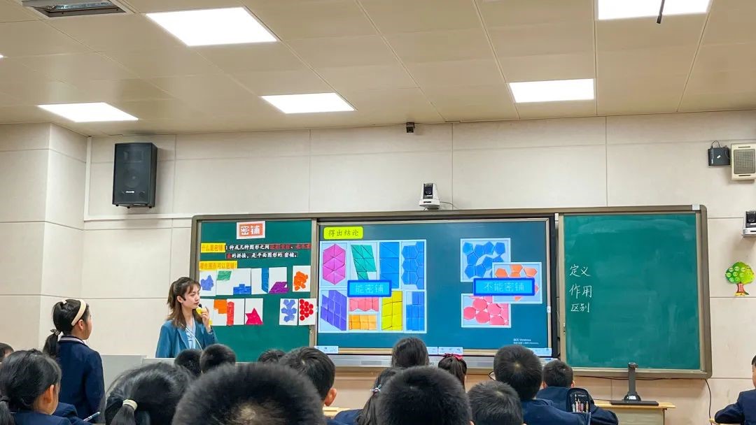 “什么是密铺?密铺的作用?密铺与一般的铺有什么区别?”孩子们强烈的好奇心和求知欲占据了李淼老师的《密铺》这节课。李老师通过几组图片,让学生自由表达什么是密铺,接着层层追问,引导学生大胆猜测,最后动手实践证实自己的猜想。李老师的课堂一环扣一环,层层递进,设计得非常巧妙。