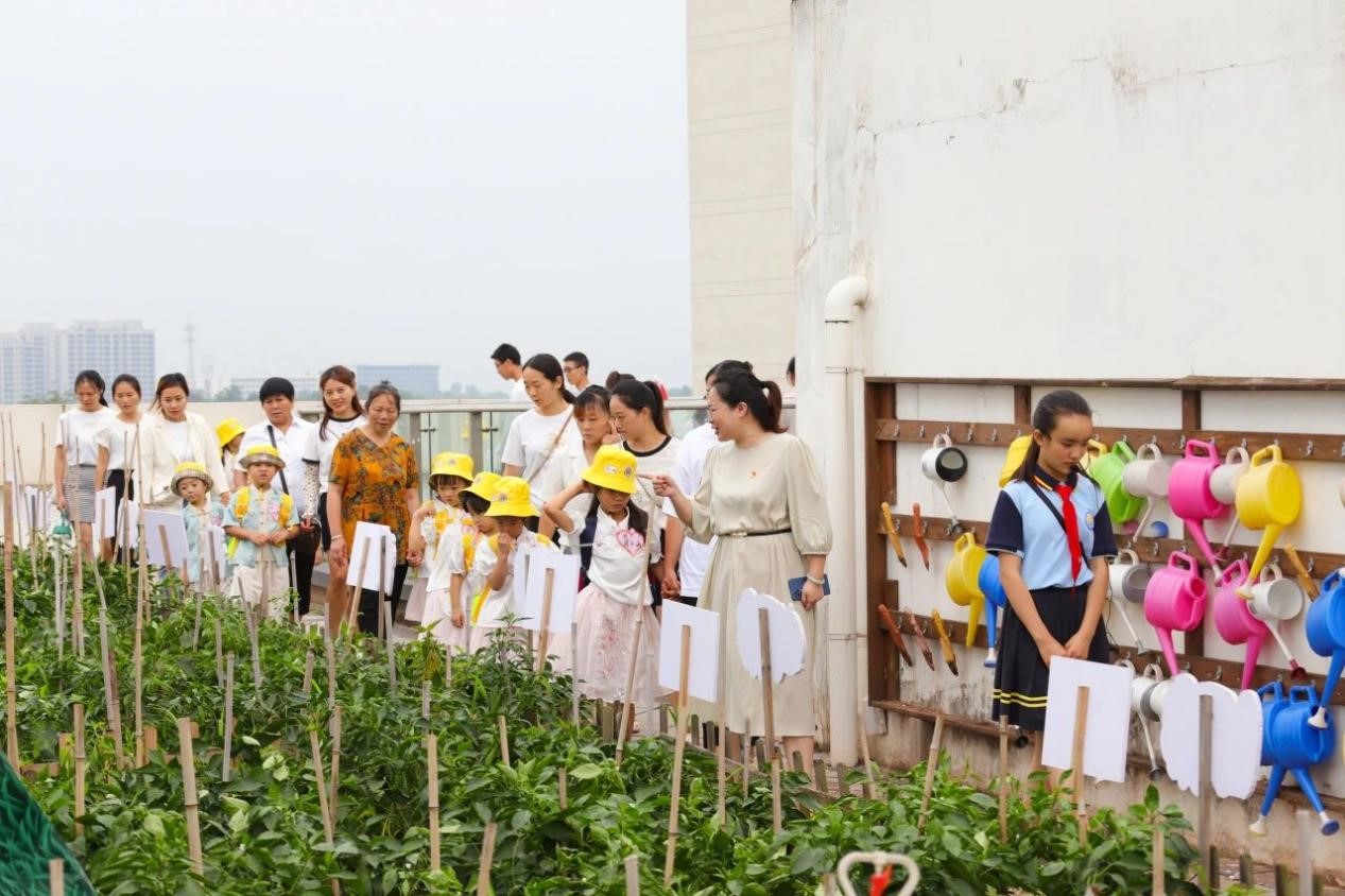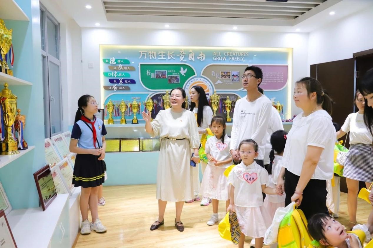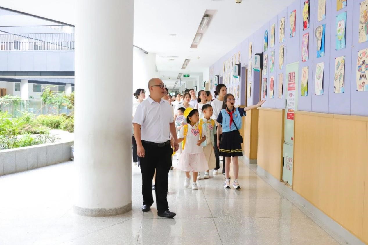 在我校老师的带领下,家长和孩子们手拉着手认真地观察着每个角落,宽阔的足球场、高大的教学楼、文化长廊、阅读区、作品展区、劳动实践基地,目光所及之处都让孩子们感到新奇而充满吸引力,他们用一双双发亮的眼睛,探访着学校的每一个角落。