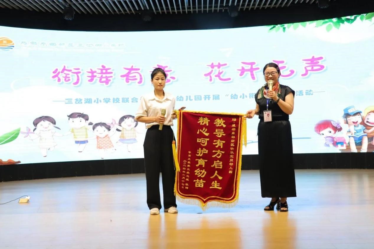 活动伊始,汪校长带来了真挚的致辞,汪校长热情洋溢的讲话,在场的家长听得津津有味,同时家长也更明白了孩子未来学习之路的方向。快乐宝贝幼儿园周园长还为三岔湖小学送上了一份神秘的礼物——锦旗,这既是对我校工作的肯定,更是我校不断追逐更好的动力。