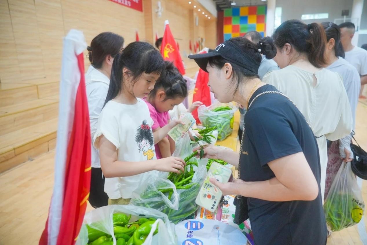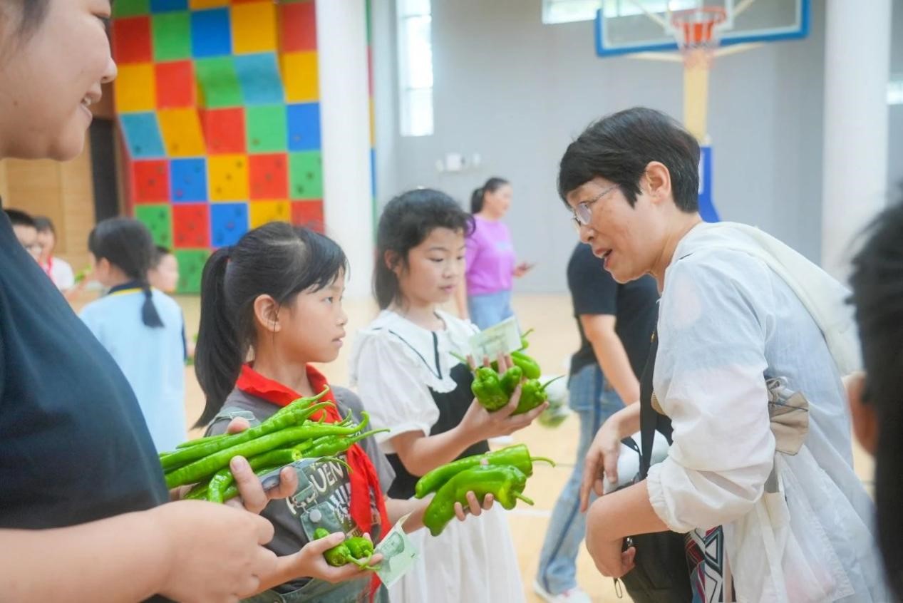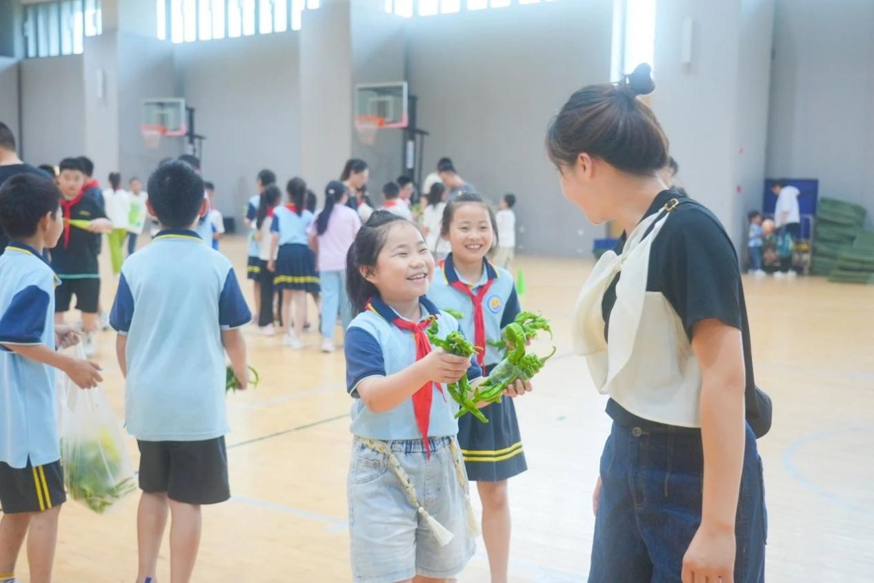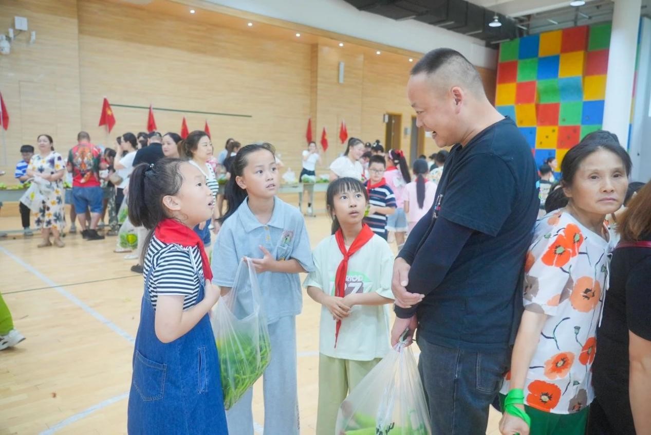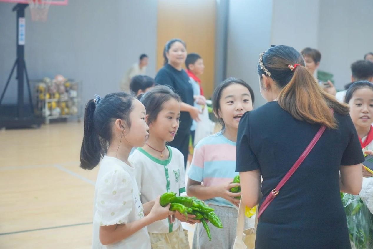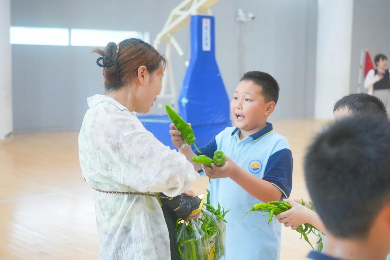 采摘完毕后,学校特别邀请了部分同学的家长,以班级为单位,在学校室内篮球场举办了一场别开生面的义卖活动。学生们兴趣盎然,纷纷展示着自己的劳动成果,向家长们介绍这些蔬菜的种植过程和自己的心得。现场热闹非凡,孩子们的欢笑声和家长的鼓励声此起彼伏。