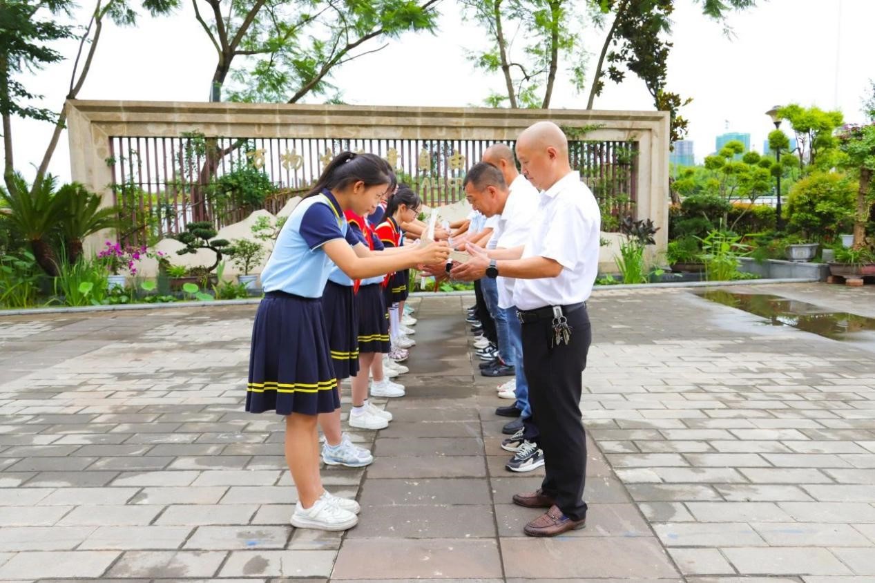 9点整,学生们穿着干净的校服,戴着鲜艳的红领巾在校门口迎接公交车司机们的到来,并一一上前问好,以此表达学生们对公交车司机们六年来风雨接送的感恩之情。