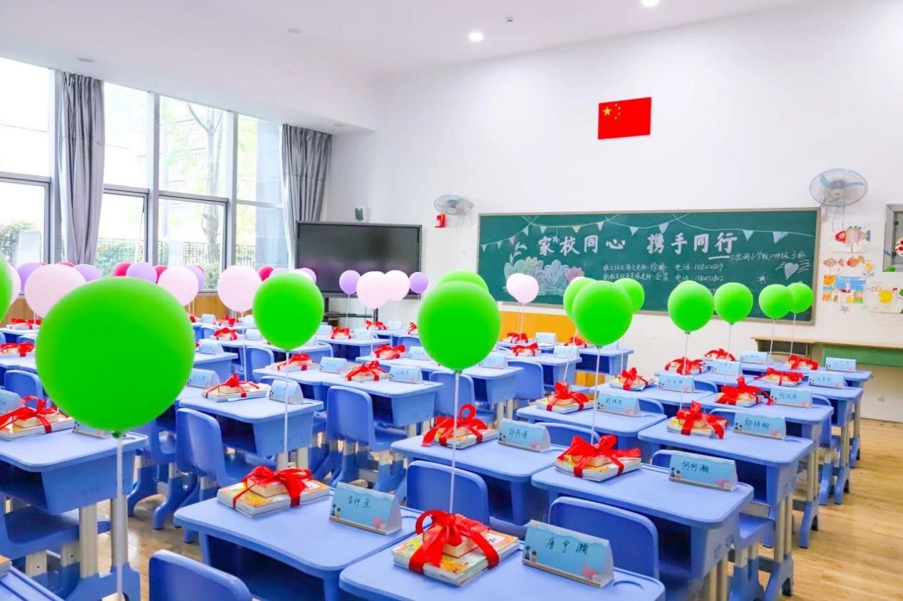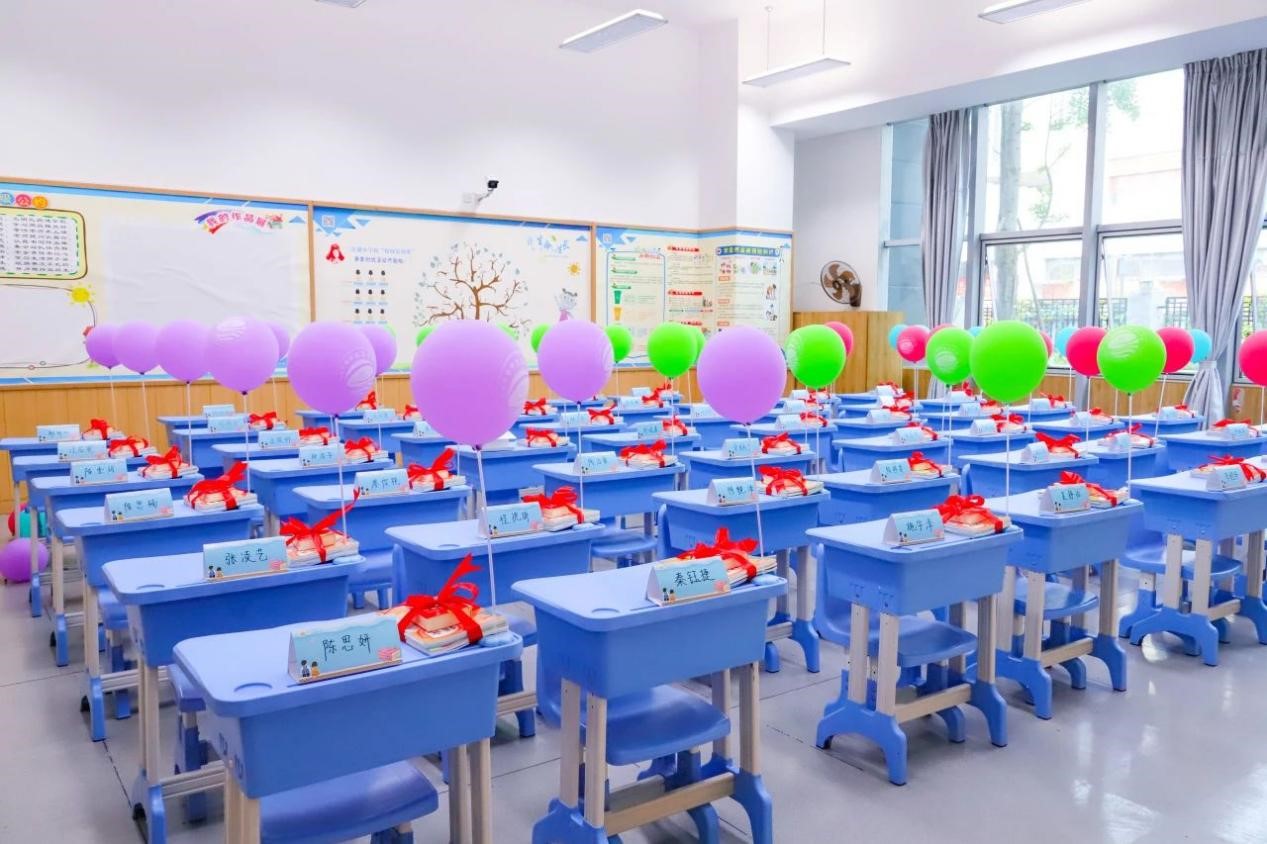 为了迎接新的湖小娃,老师们开学前就在悄悄地“密谋”着大事,原本空荡荡的教室在他们的巧手下,摇手一变,一幅幅精美有爱的黑板报、一排排整齐的干净桌椅、一个个五彩斑斓的气球、一摞摞红绸带捆绑的课本,处处都是充满童真童趣的装饰,太好看啦!