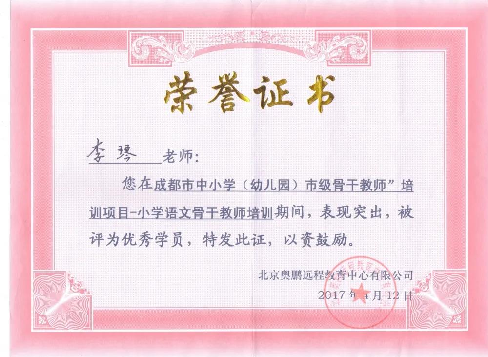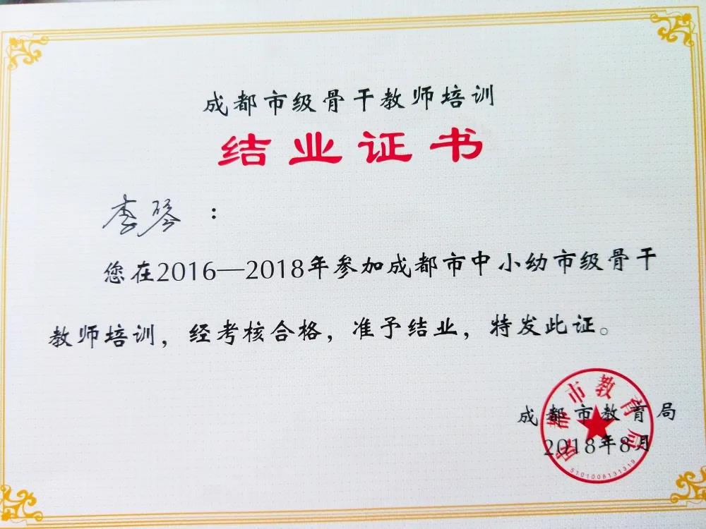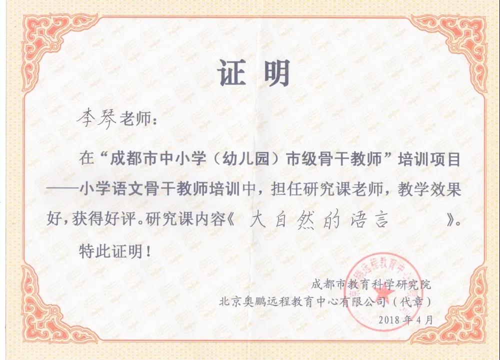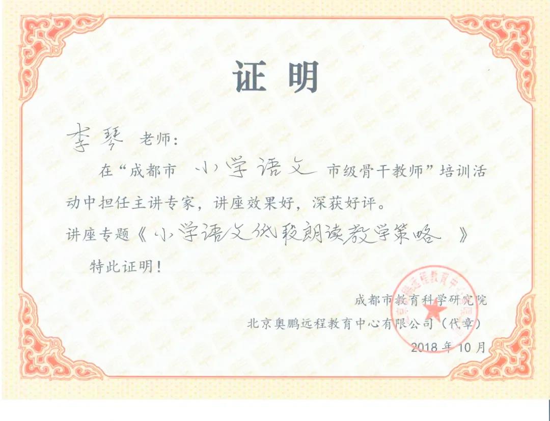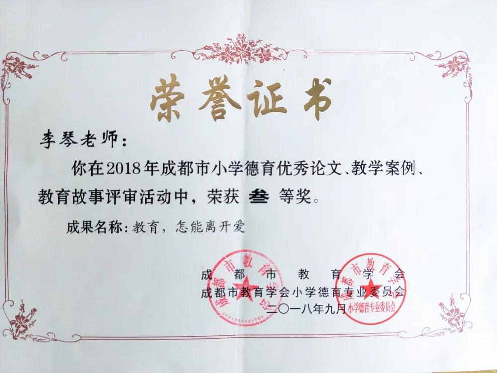 她善于总结和反思,多篇论文获县级以上奖励或发表。其中,论文《在作文教学中培养学生创新精神》,在全国课程标准《语文》优秀论文评选活动中,由教育部语言文字应用管理司和教育部语文出版社教材研究中心颁奖,获优秀论文一等奖。论文《阅读,走向“三度”》 2017年5月在 《四川教育》发表。2018年9月,德育论文《教育,怎能离开爱》获成都市三等奖。2018年10月,在“成都市小学语文市级骨干教师”培训活动中担任主讲,专题《小学语文低段朗读教学策略》,讲座效果好,深受好评。