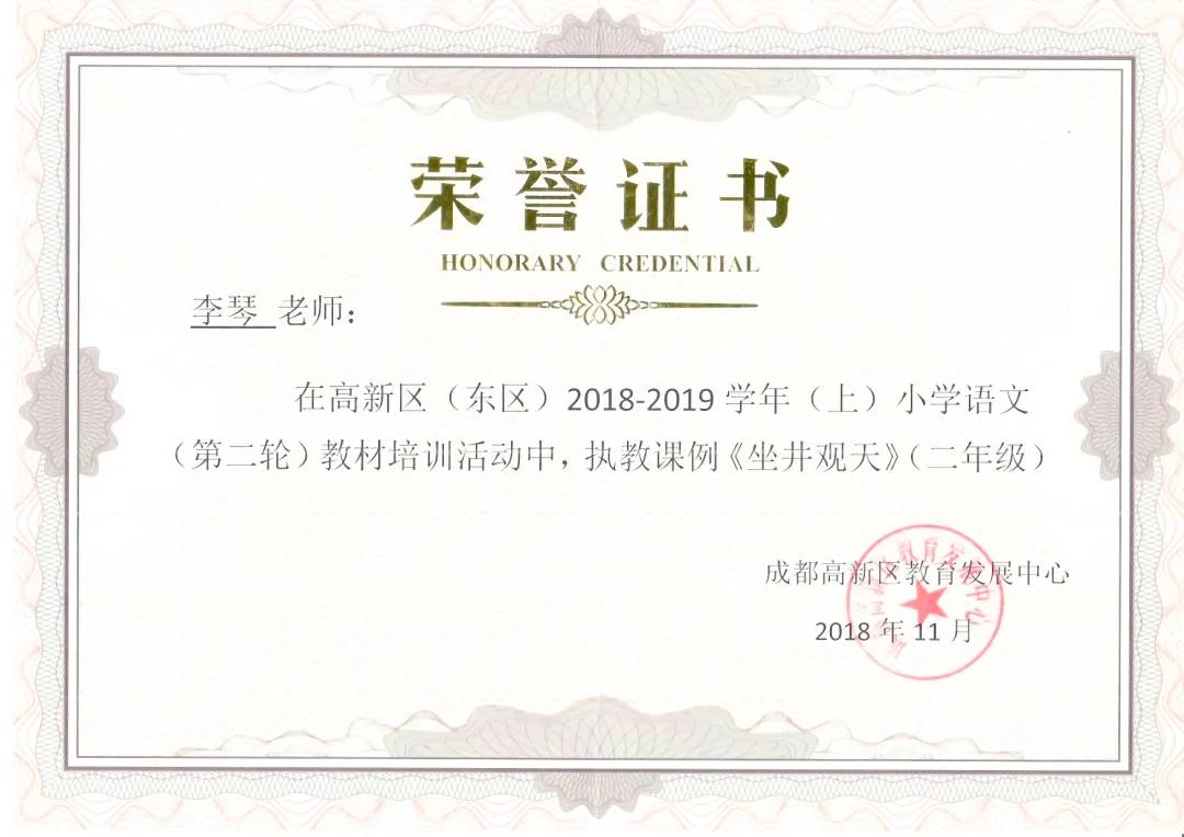 她有较强的教学能力,成绩优异。2012年6月,《雪顿节上看赛牛》获资阳市二等奖。她担任学校语文学科带头人暨导师,担任年级语文集体备课组长,努力成为学科教学的示范者与引导者。她将自己的教育理念与教学方法提炼出来,承担了各级各类研究课,示范课等。2016年9月,为高新区调研活动提供课例《句子分类复习》;2017年10月,为全校语文教师提供示范课《ai,ei,ui》;2018年4月,为成都市小学语文骨干教师培训,提供研究课《大自然的语言》;2018年11月,为高新区2018秋小语二年级第二阶段培训提供课例《坐井观天》。同时,深入课堂,悉心指导多名参赛教师,在成都市的教学比武中取得佳绩。