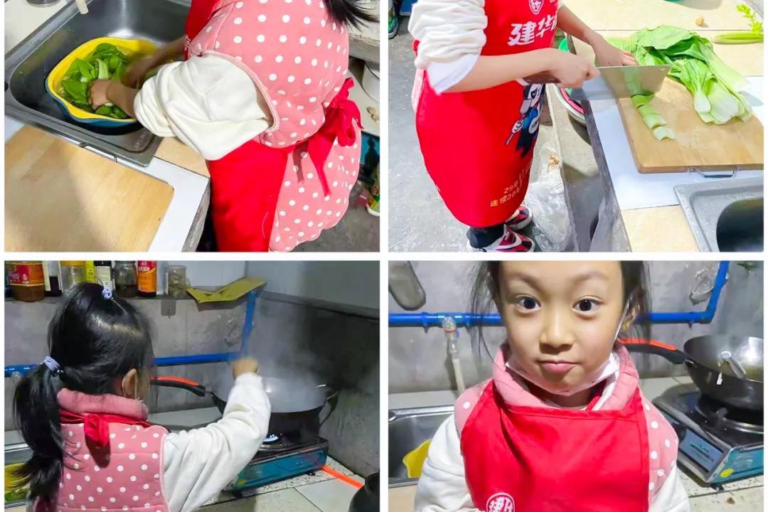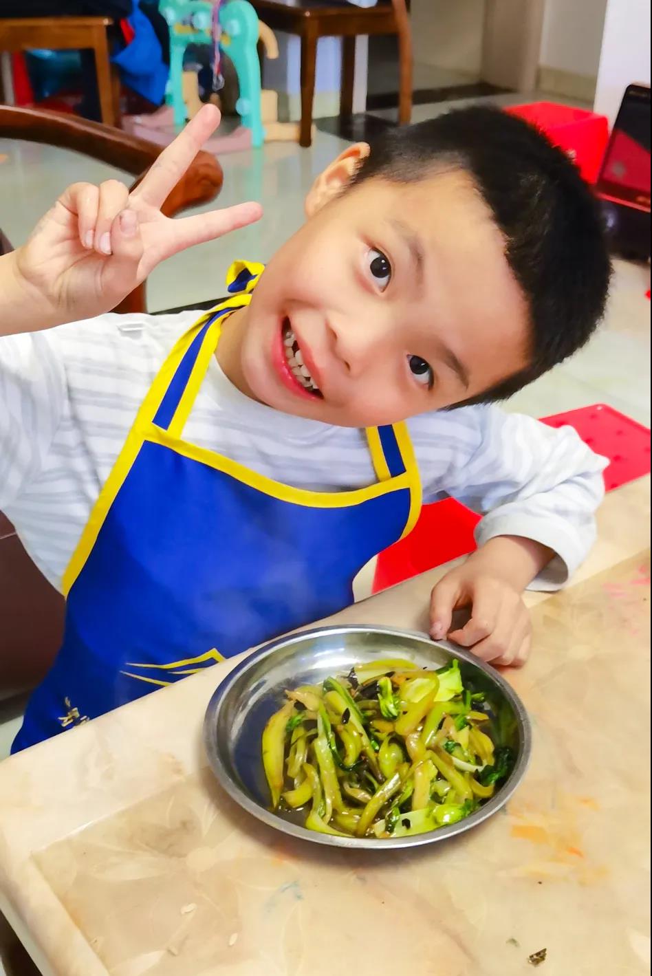 放学归家,孩子们已迫不及待变身“小厨师”,各显身手。小厨师们把家长从学校义买回来的蔬菜,用心做成了温馨的家庭菜肴,细致的择洗、小心的切剪、不太熟练的翻炒、精致的摆盘。这种成就感和喜悦感自是不言而喻的!