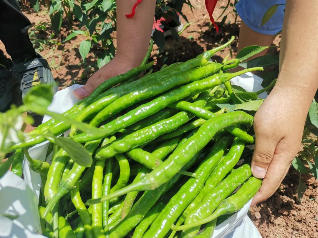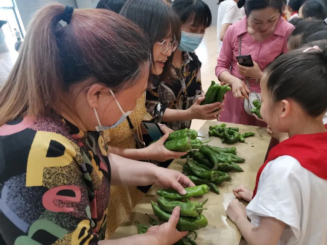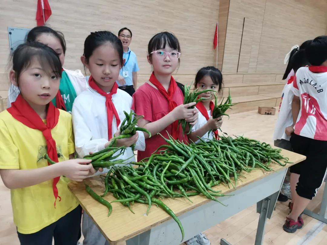 瞧!3.5班的孩子们,双手捧着二荆条辣椒,脸蛋上洋溢着幸福的微笑。查看有无“漏摘之椒”的小小“搜查员”,绝不放过一根的神情,真可爱!当然,3.4班的大青椒也不少。从孩子们整齐划一的采摘姿势,就能感受到这分量可不轻,你一根我一把,一会儿就摘了满满的一箱。