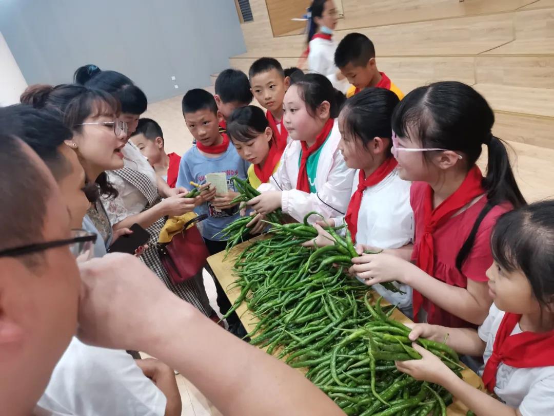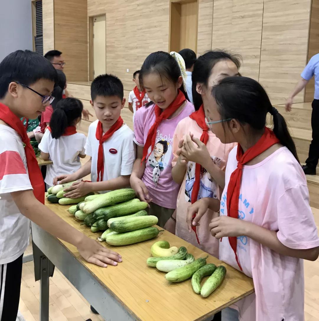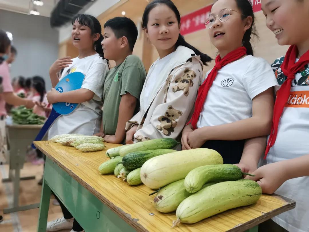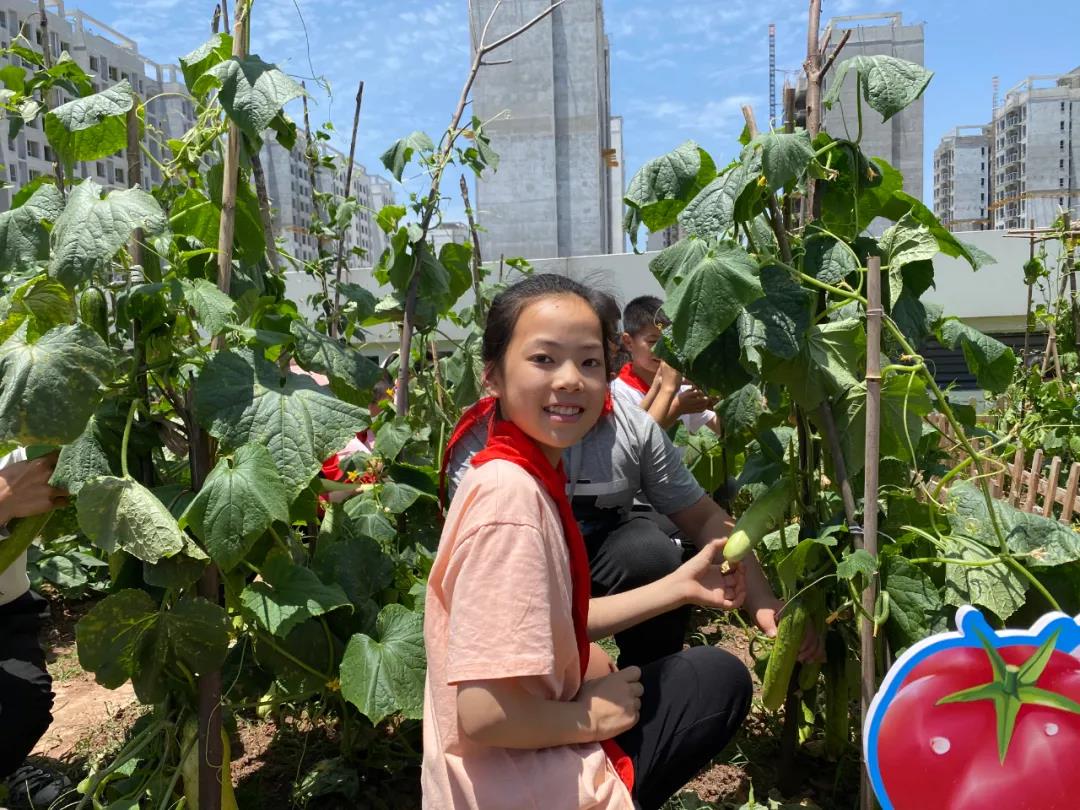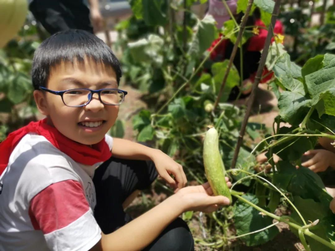 看完二荆条的“火辣爆满”,那让5.7班的水果黄瓜“清凉一夏”吧。他们或蹲或跳,或探手去择瓜,或与老师分享收获的喜悦。一同学举着黄瓜,兴奋地说“看着就好脆哟,这么热的天,真想立马咬一口解凉!”大家分工合作,收获颇丰。