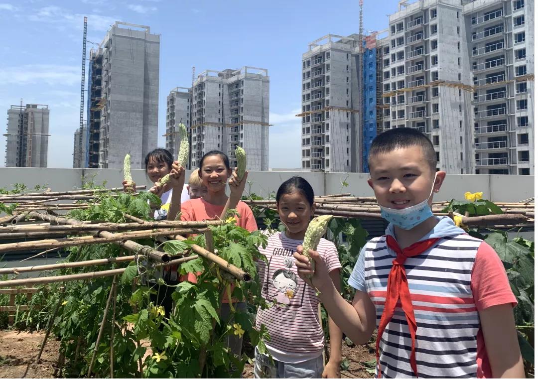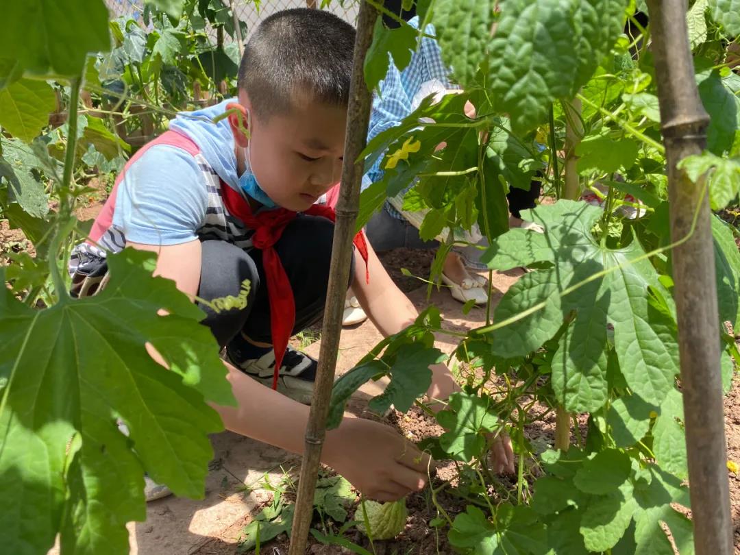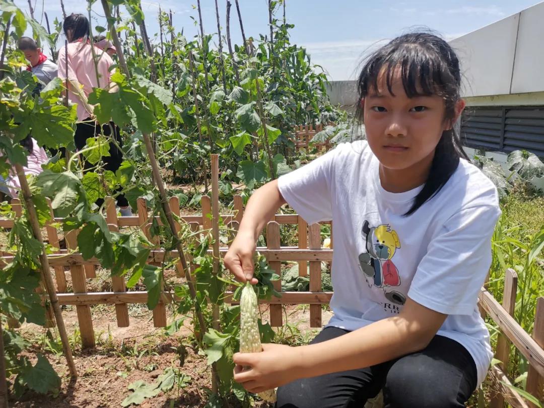 咦,5.6班的同学们高举的“战利品”怎么形态各异呢?走近一看,原来是消热解毒的苦瓜。别看个头不大,可都是绿色有机、不含农药的哟。孩子们在一片绿藤支架中翻找熟透的苦瓜,如寻宝一般,可兴奋了。