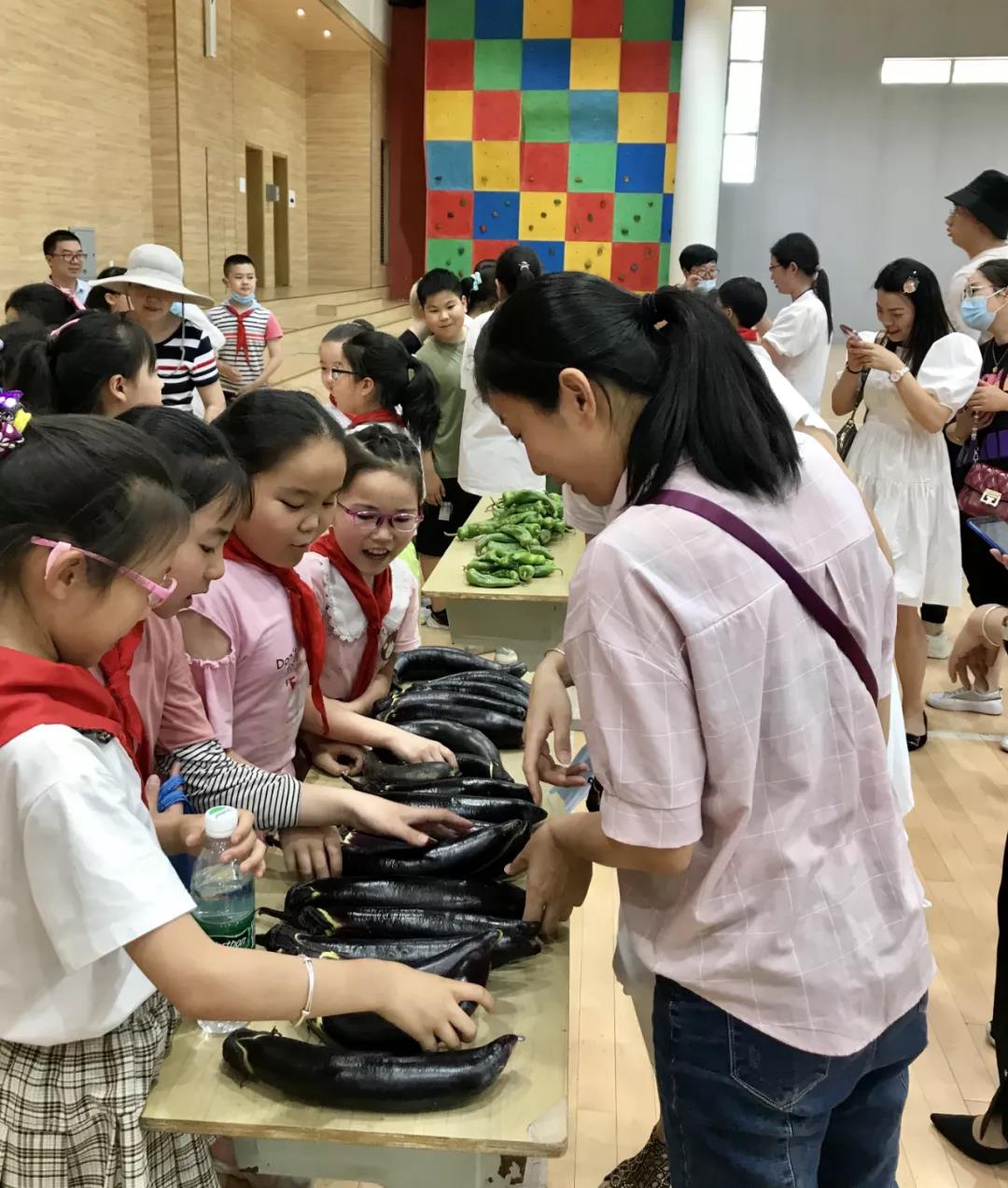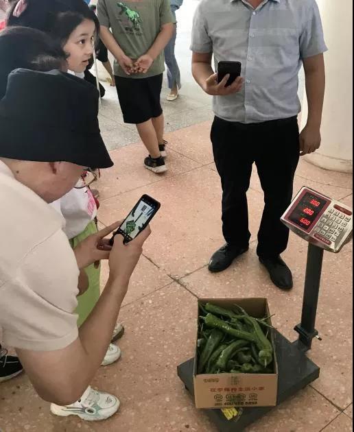 虽然孩子们的小手上沾满泥土,裹着汁液,但丰收的喜悦在他们的脸上洋溢开来。采摘完毕,各班有序的在一楼食堂集合,将蔬菜瓜果进行称重、捆扎,再到室内篮球场商讨义卖方案,分区域摆放,等待家长们前来购买。
