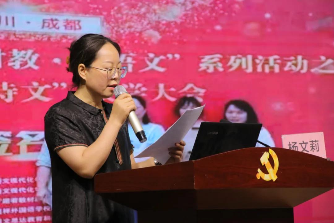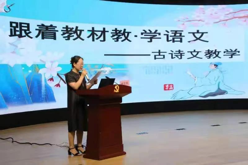 杨文莉老师以《跟着教材教•学语文》为主题,分享了在成都嘉祥外国语学校观摩的古诗文教学大会的感受。杨老师结合视频、图片,生动地向老师们分享了王旭明、王丽华、罗良建三位专家的课例及讲座。王旭明理事长执教的《杨氏之子》,用“读”“背”“诵”“说”“用”阐述了古诗文学习的步骤流程,强调古诗文教学要重视字、词教学和读背的训练,更要放在“用”上。王丽华教授执教的《自相矛盾》,提出要特别关注不同学段古诗文教学的课标要求,要从课后练习题出发精准把握教学目标,精心设计教学过程。罗良建老师在其讲座中精辟地分享了自己的教学领悟:“作为教师,我们要跟着教材教•学语文,不要依赖教参、教案、PPT。”“教什么、怎么教,我们都要有自己的思考,要做一个乐学、善思、勤读、常写的老师。”