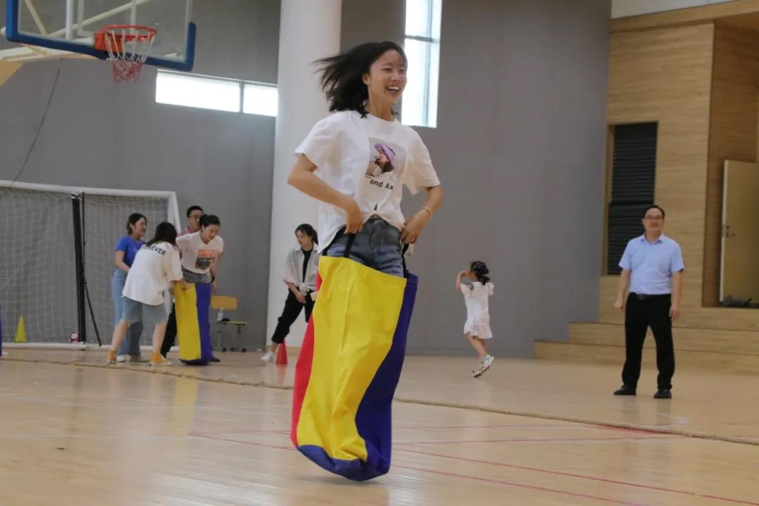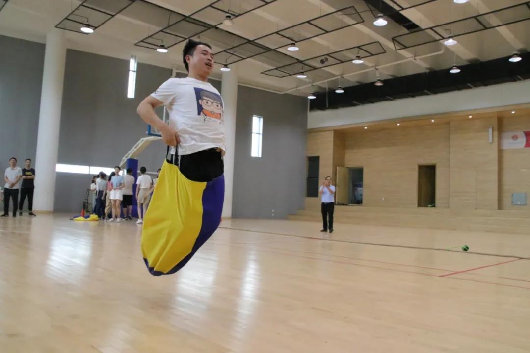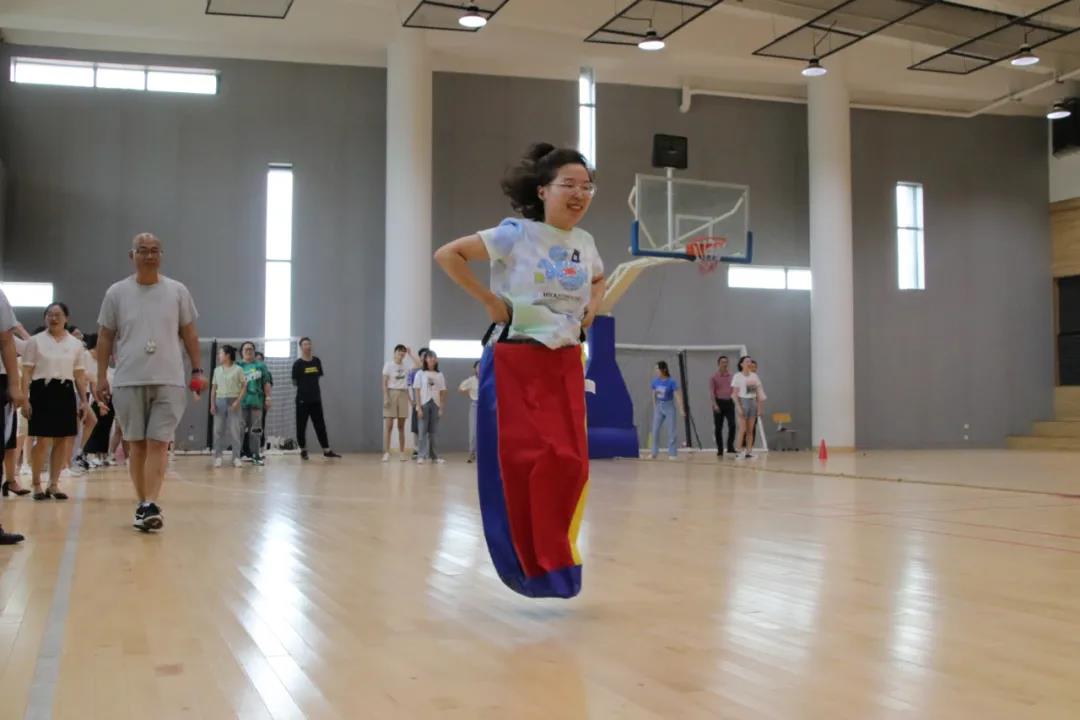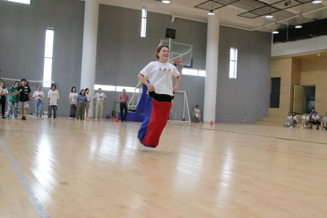 首先进行的是袋鼠跳活动。老师们化身矫健的小袋鼠,将自己装进“口袋”,努力用双脚向前蹦跳着。一个个跳跃的身影成了赛场上快乐、勇敢的音符,摔倒了,爬起来再跳。