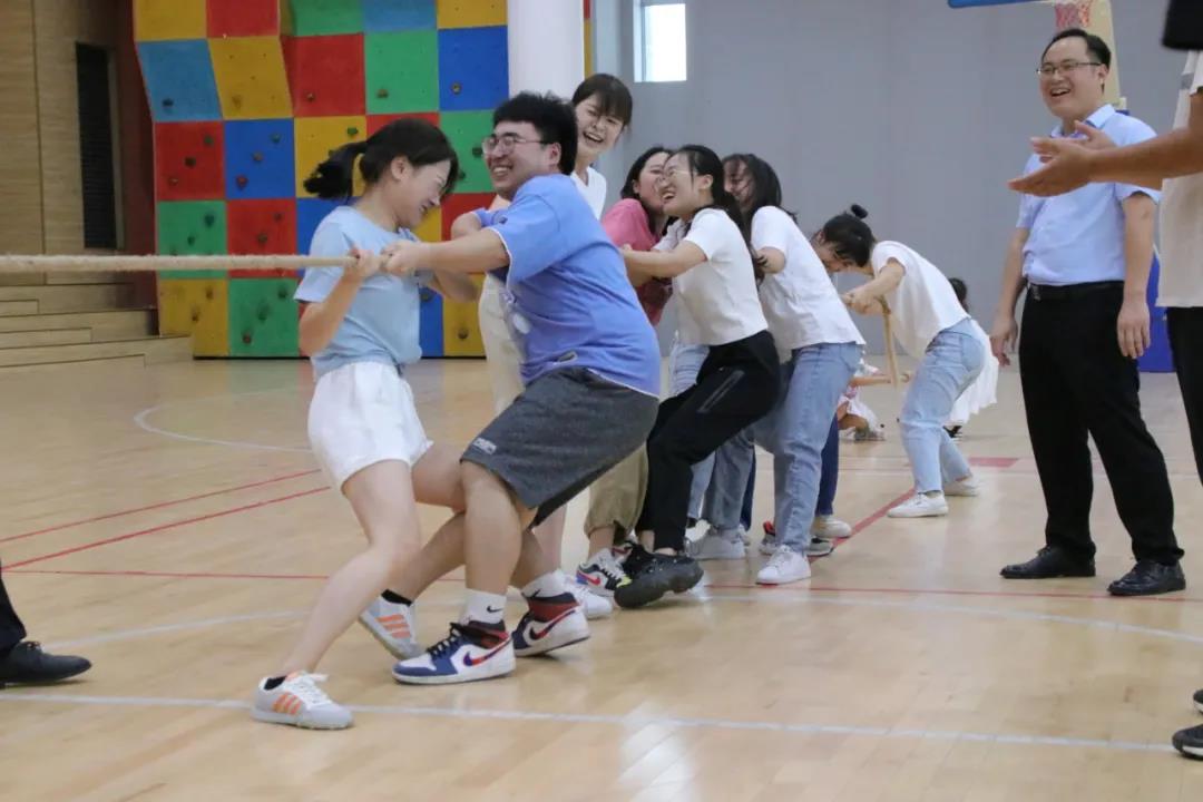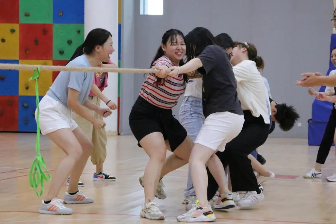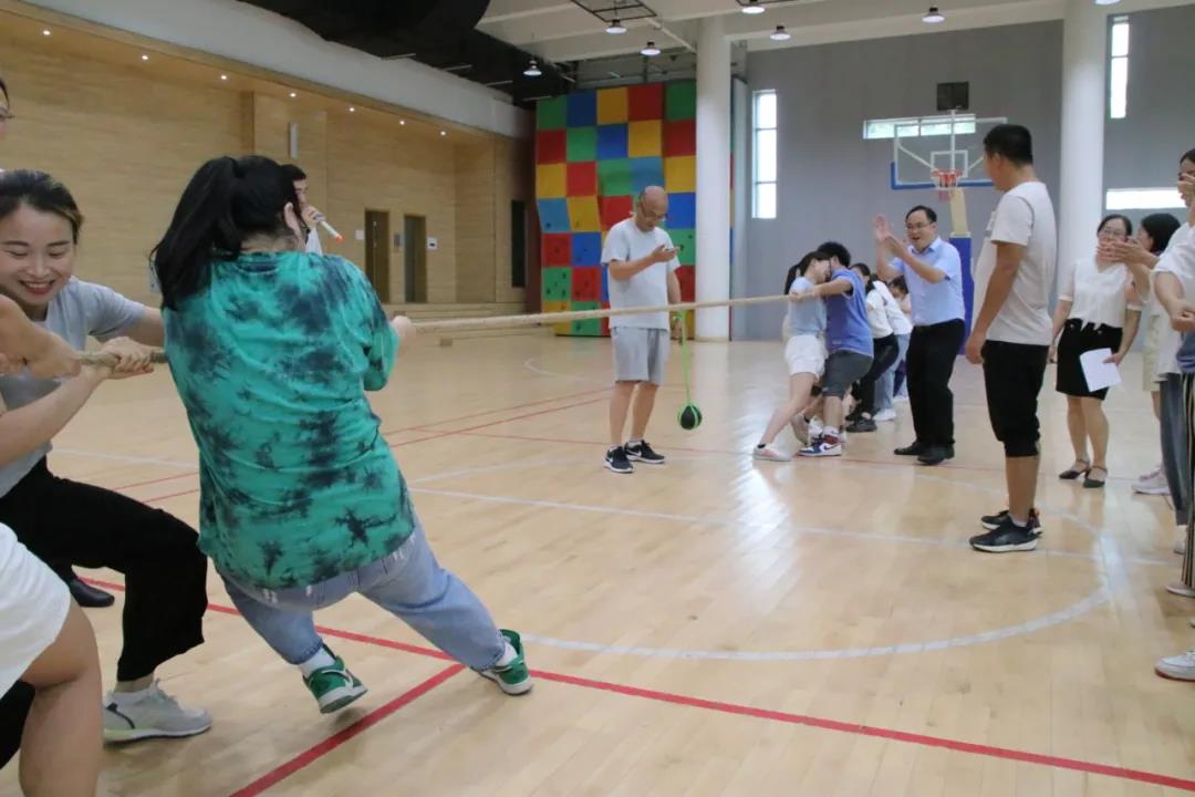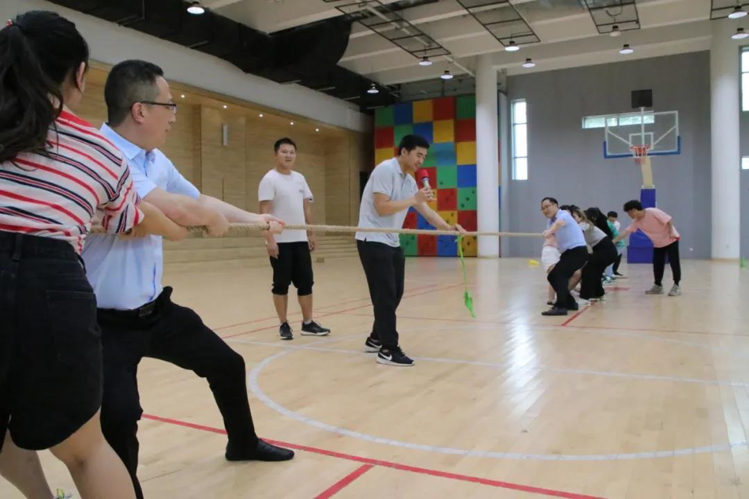 接着进行的是拔河比赛。参加拔河的老师们双脚助力,双手紧紧地拉住粗大的绳子努力向后拉着,那一张张因过度用力而变得通红的脸颊是那样可爱,那样美丽。现场到处充斥着加油声、助威声。赛场上的老师们更加努力地向后拉着,似乎要把洪荒之力完全释放才罢休。此时,胜利已经不重要了,体会到团结的力量才是老师们奋斗的目标。