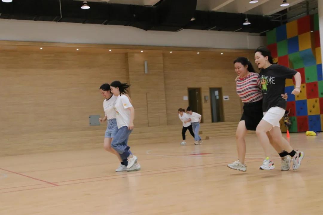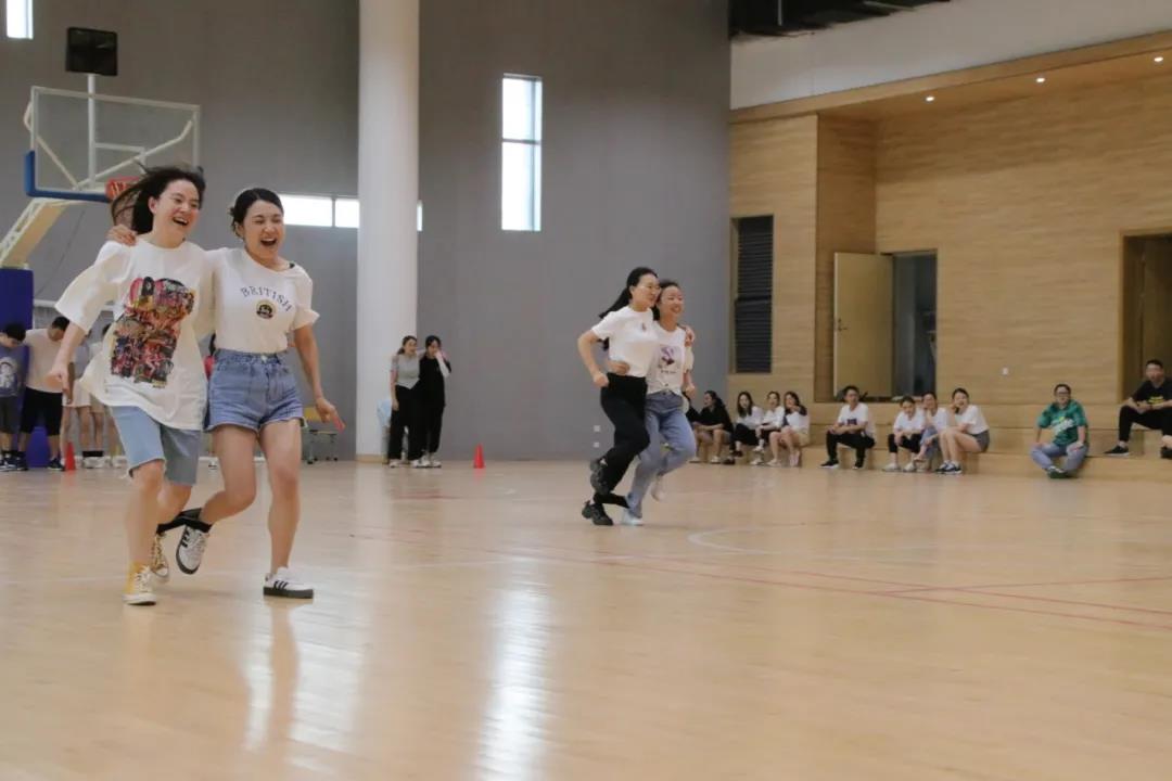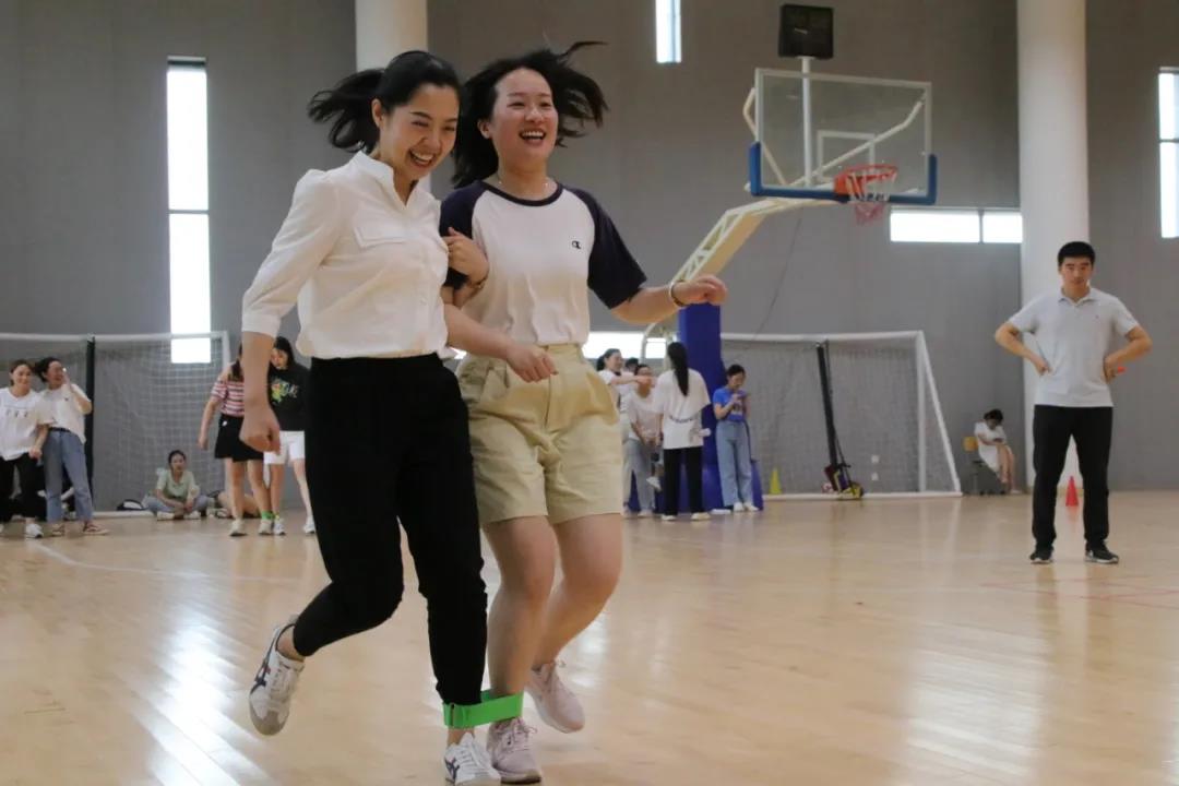 之后的“两人三足”接力跑活动更加有趣。各组的老师们两两组合,在轻声的“走”中两人同时抬脚,配合协调,虽然偶然会有那么一点点不和谐,但很快就会重新并驾齐驱。场上的老师们或加油,或品评,或称赞,或惊喜,纷纷为各组参赛队员们送去最热烈的掌声。