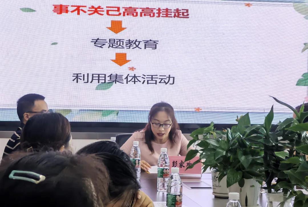首先,彭家欢老师以《细抓养成教育 优化背景常规》为题,主要从培养一年级学生良好的行为习惯、培养班干部、培养学生集体荣誉感三个方面进行了经验分享。彭老师认为,一个班就是一个大集体,班主任就是学生健康成长的引路人,是良好班风的倡导者和引领者,良好的班风对孩子的成长至关重要,将使孩子终生受益。