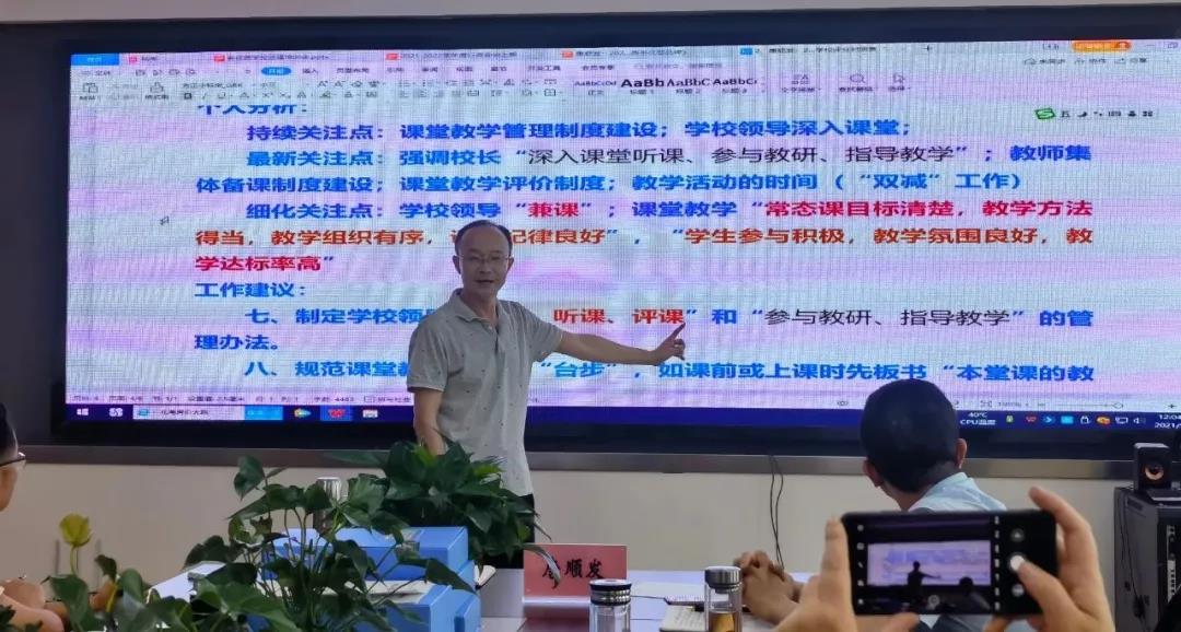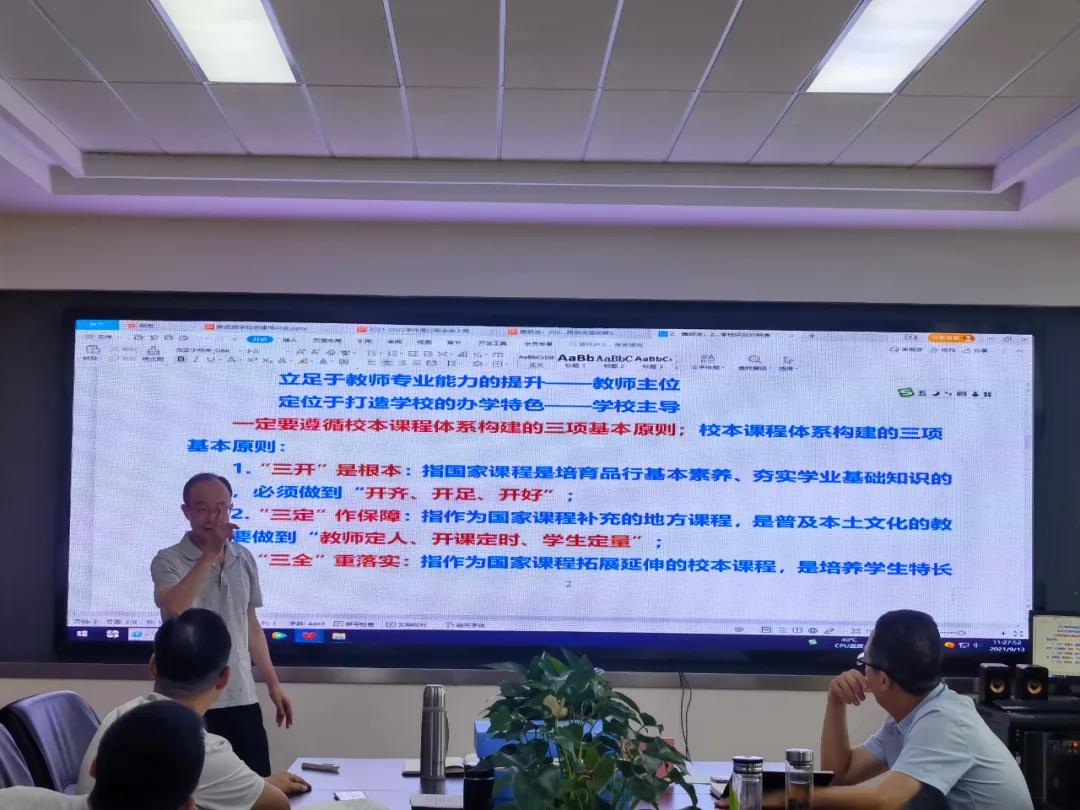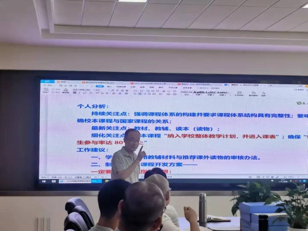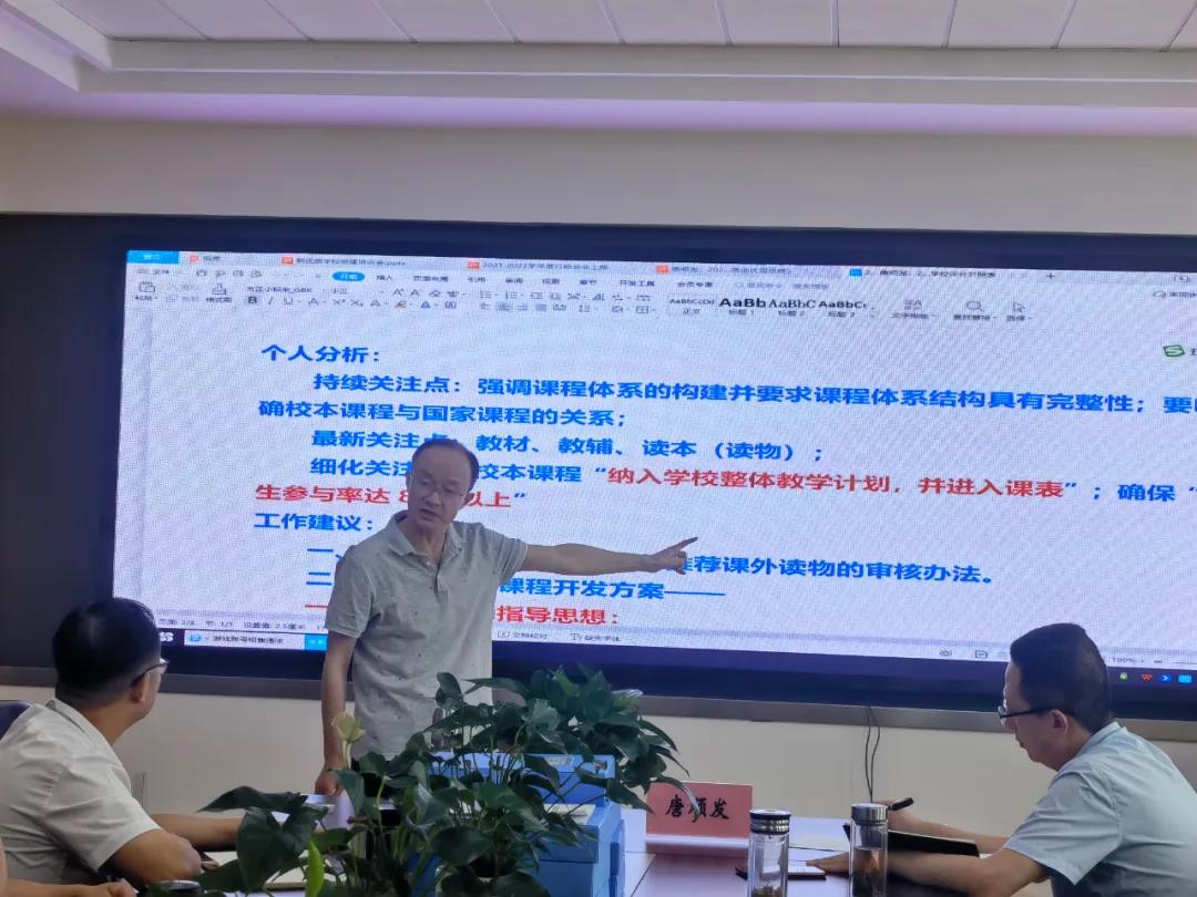 唐老师对应评分细则,就平时工作和申报资料准备中的细节问题进行了针对性指导。唐老师建议,一是学校要严格把控教辅材料与课外读物的审核流程;二是学校要制定、完善校本课程开发方案,方案中要明确总的指导思想,要秉持校本课程“一本三主”的基本理念,要遵循校本课程建构的三项基本原则,要满足校本课程开发的基本要素,要有校本课程开发的基本流程,要突出校本课程中的特色课程;三是要完善各项管理办法,落实校长听课、参与教研、教学指导等;四是规范课堂教学,教师要严格落实“学生主体、教师主导”的教学理念;五是制定学生作业管理办法、让学生、家长了解学校的“双减”“五项管理”等工作举措。