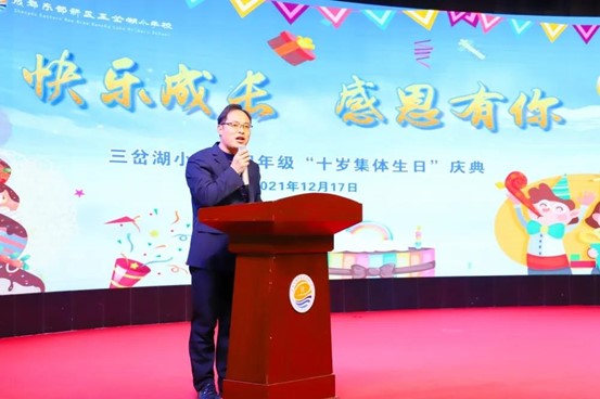 活动在副校长汪辉勇的热情致辞中拉开序幕。汪校长给孩子们带来了诚挚的生日祝福,并教育同学们要感恩父母、感恩老师、感恩祖国,鼓励同学们以今天的生日庆典为起点,立爱国之志,勤奋学习,发奋进取,以出色的成绩和实际行动谱写人生美好的华章。