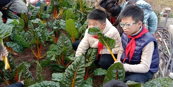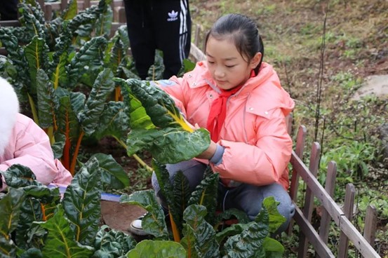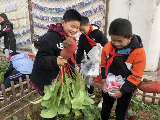劳动中,孩子们喜笑颜开。看到几个月前亲手种下的蔬菜已经长得肥硕而蓬勃,丰收的喜悦溢于言表。