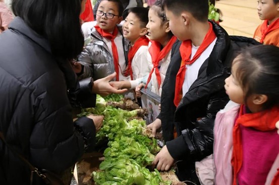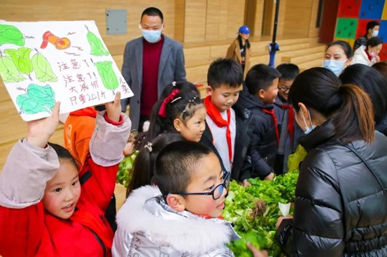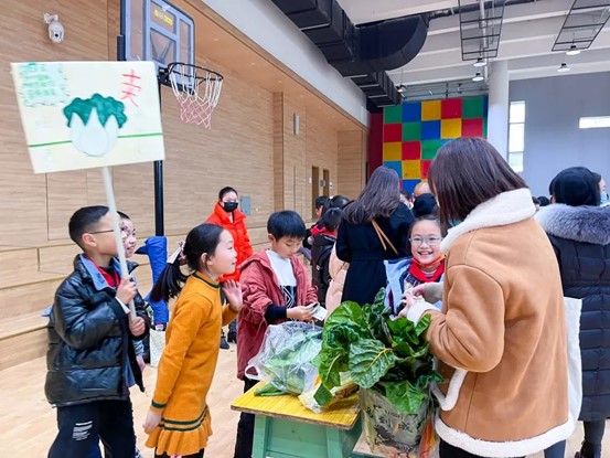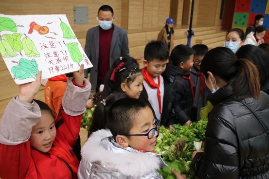 蔬菜一入市,孩子们纷纷化身小小推销员,提着一袋袋蔬菜扑面而来,一个个摊位井然有序,一位位售货员严阵以待。举起推销牌,赶紧吆喝。