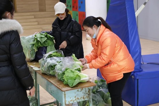 这边还在忙碌下称分装,那边“岔小”的室内篮球场早已布置一新,一切准备就绪,俨然成了一个大型的菜市场。