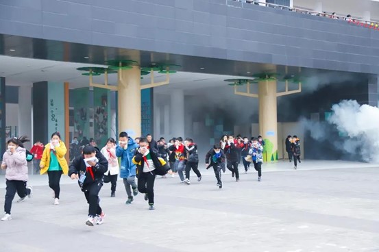 9时30分,后勤处副主任涂建再次对全体师生进行演练培训,让大家熟知演练要求及注意事项。9时35分,所有楼道值守教师和工作人员就位。9时40分,随着警报响起,浓浓的烟雾升腾起来,同学们在各班老师的指引下,用毛巾、衣襟、衣袖等物品捂住口鼻,弯着身体、快速有序地按照既定的逃生路线,撤离到学校运动场。