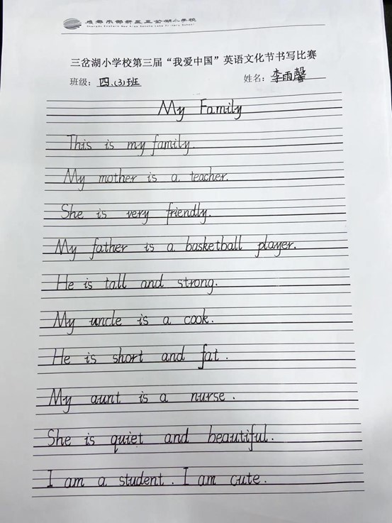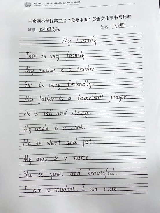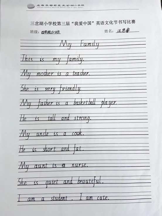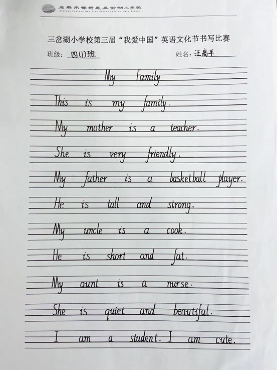 本届英语文化节以“I love China!”为主题,全校三至六年级的学生积极参与,兴趣盎然。通过英语书法秀、模仿表演秀、文化海报秀的活动,孩子们绽放自己的才华,展现出了阳光、自信的自己。
