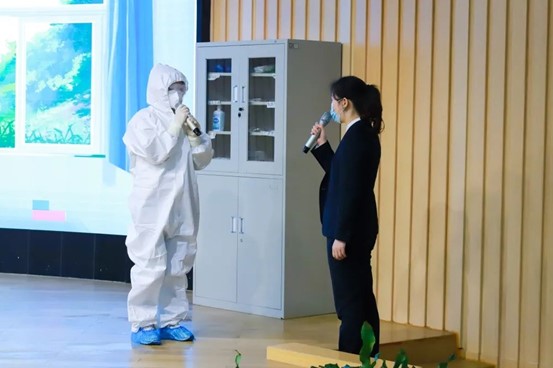 演练结束后,卫健委领导佘小芳就疫情防控处置演练中的细节处置进行了专业指导:一是口罩的佩戴和处理方法要准确;二是在处置过程中,要充分做好消毒人员、医护人员和教师的个人防护。