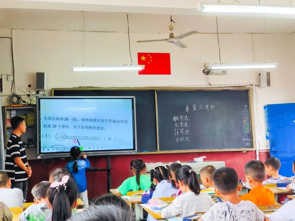 第二堂课是由李鑫老师带来的《重复的奥秘》,李老师利用耳熟能详的故事”从前有座山,山里有座庙,庙里有个老和尚.....”引入课题,接下来李老师引导孩子们观察一幅有规律性的情景图,让孩子们交流重复的规律,并用不同的符号表达规律,让孩子们体验到用符号来表达现实情景更清晰、更简化,潜移默化地培养了孩子们的符号化思想。