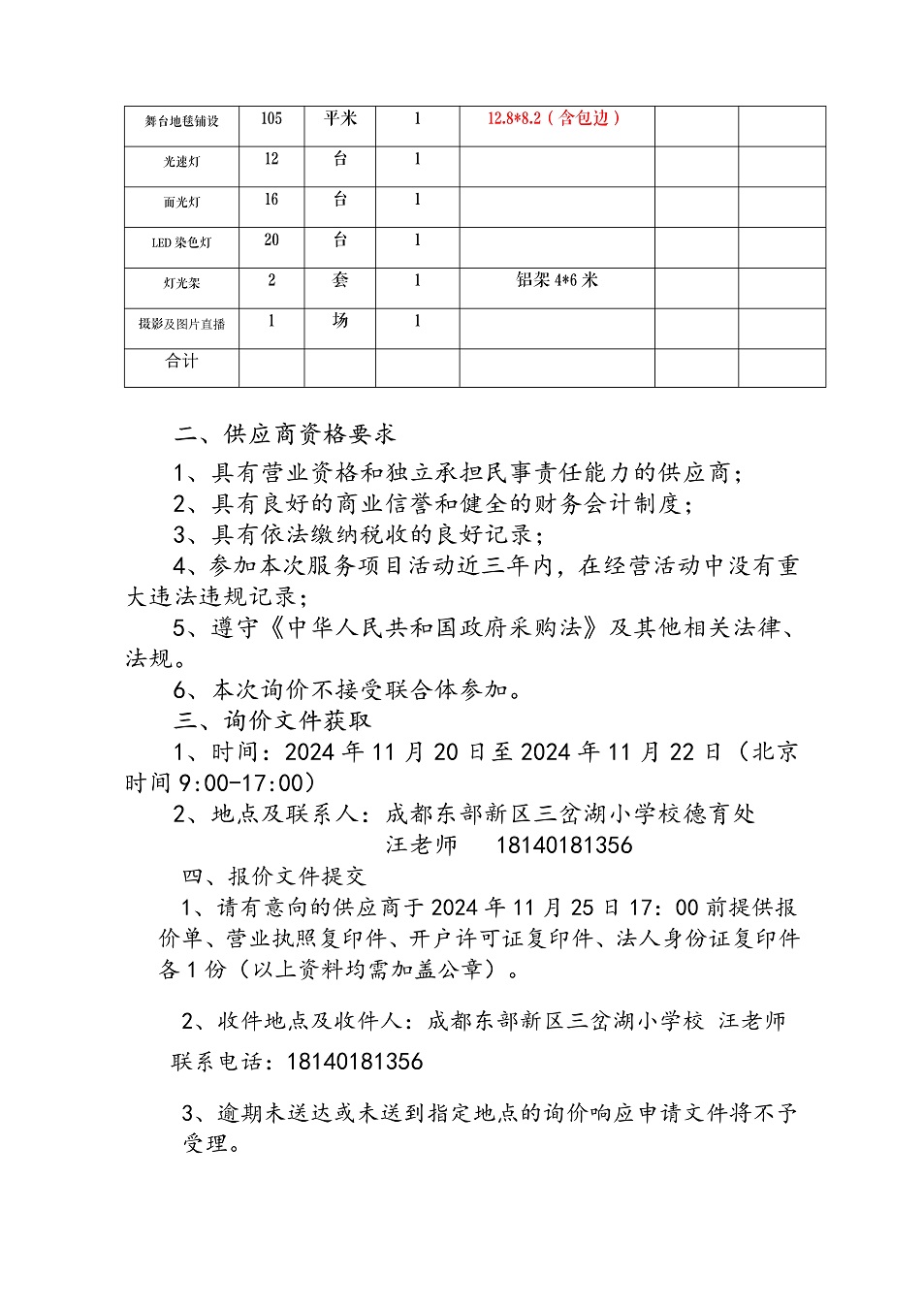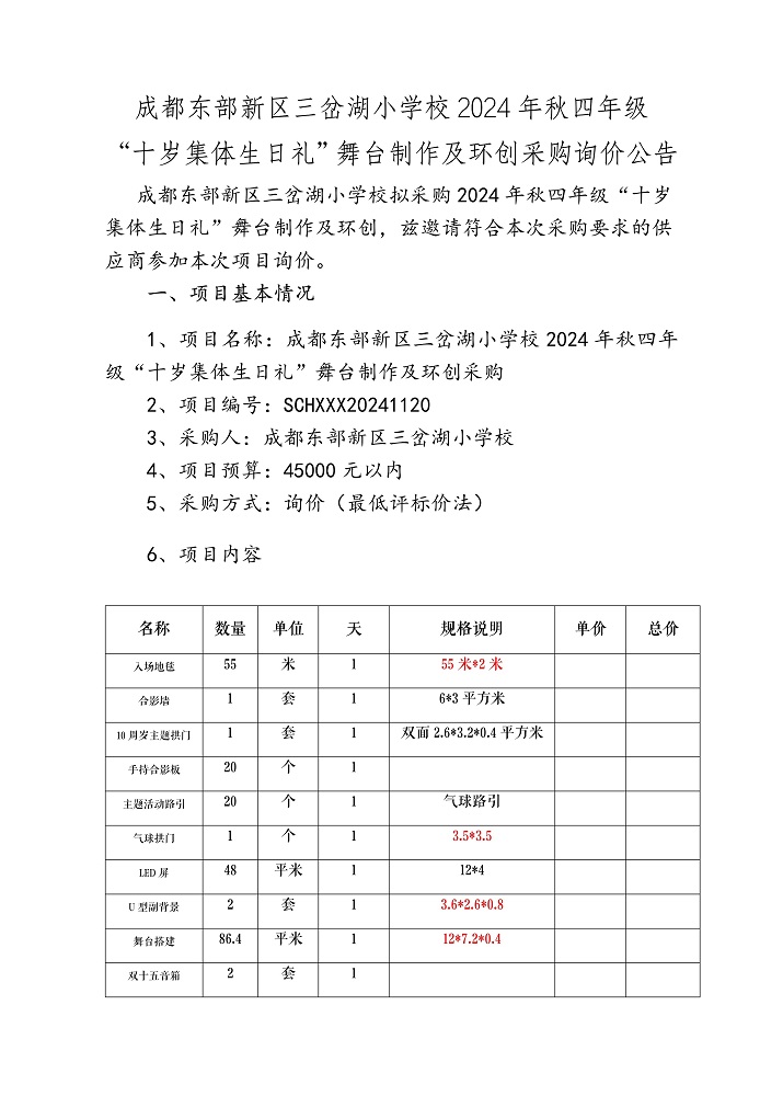 成都东部新区三岔湖小学校2024 年秋四年级“十岁集体生日礼”舞台制作及环创采购询价公告