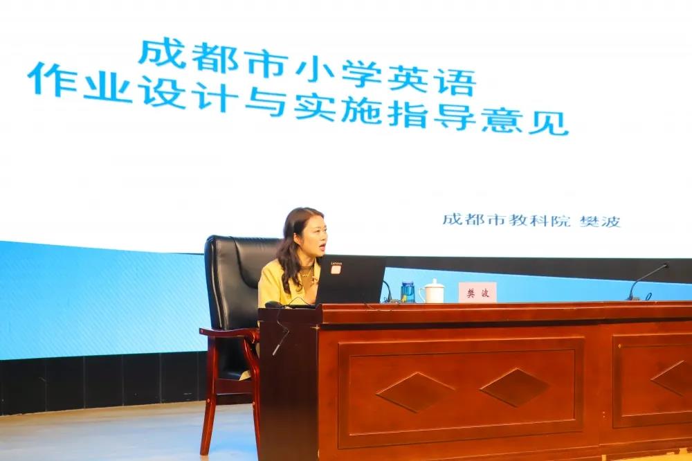 然后,教科院小学英语组的樊波老师以《成都市小学英语作业设计与实施指导意见》为题为大家作了精彩报告。樊老师提出小学英语作业设计要以促进学生全面发展、检测课堂教学效果、提升课程教学质量,促进学生听、说、读、看、写等能力全面发展为总体目标;以“提质控量”为基本要求。樊老师对小学英语的两种作业类型作了细致分析。基础性作业要从语音作业、词汇作业、语法作业这三方面着手。综合性作业可以开展丰富多彩的主题活动:演讲比赛、英语故事表演、主题汇报......还可以进行实践类作业、学科融合作业等等。最后,樊老师从作业布置与批改以及作业反馈这三方面提出了相关建议。要求老师们作业布置要精炼、作业批改要规范、作业反馈要及时、形成优质作业资源,螺旋提升作业设计的质量。
