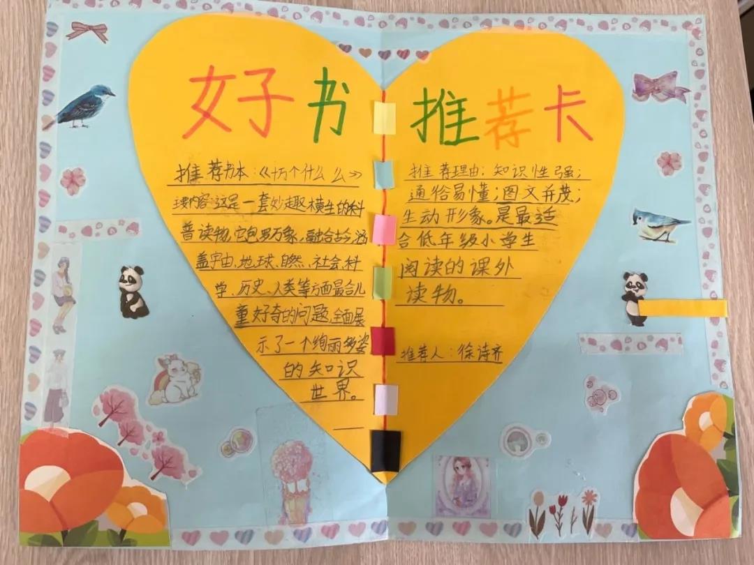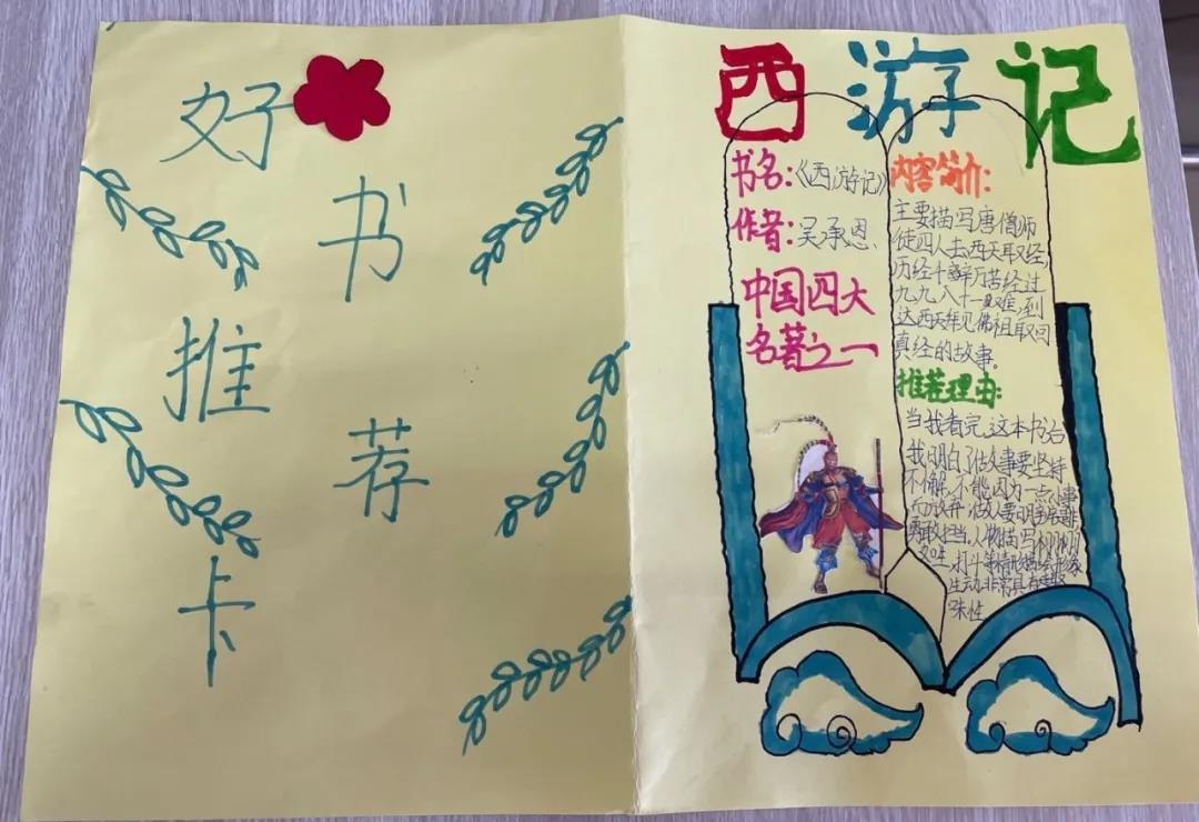 读一本好书对于我们而言,就是一座灯台,指明我们前进的方向;就是一束阳光雨露,滋润我们茁壮成长;就是一台净化机,净化我们的心灵,成就我们的人生,使我们得到人生中真正的享受。此次好书推荐活动,同学们的作品精彩纷呈,或设计人物名片,或绘制思维导图,或制作精美的推荐卡。