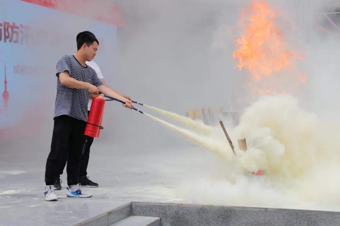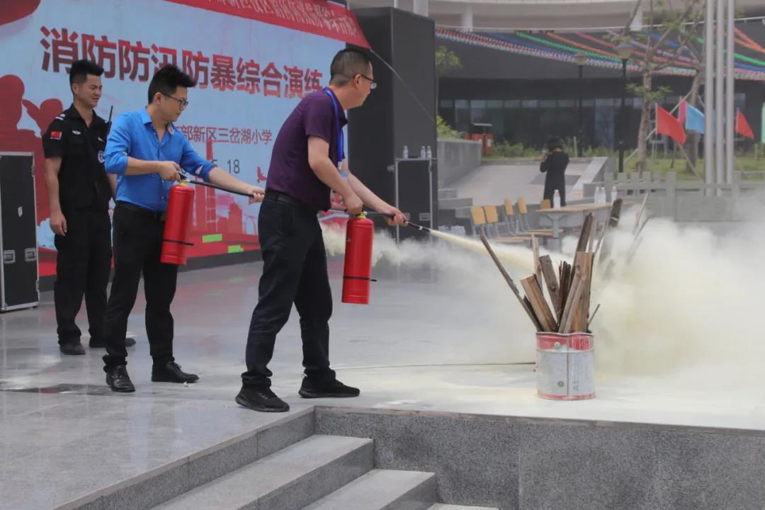 首先进行的是消防演练,消防演练分理论培训和实践操作两部分。培训过程中,演练负责人讲解了有关火灾现场的应急处置方案,灭火器的使用原理以及相关的注意事项。随后,他详细讲解了灭火器的使用方法和消防水带连接等。我校副校长汪辉勇、郭勇,后勤主任涂建及保安人员认真观摩灭火器使用方法后,逐一进行操作、体验。