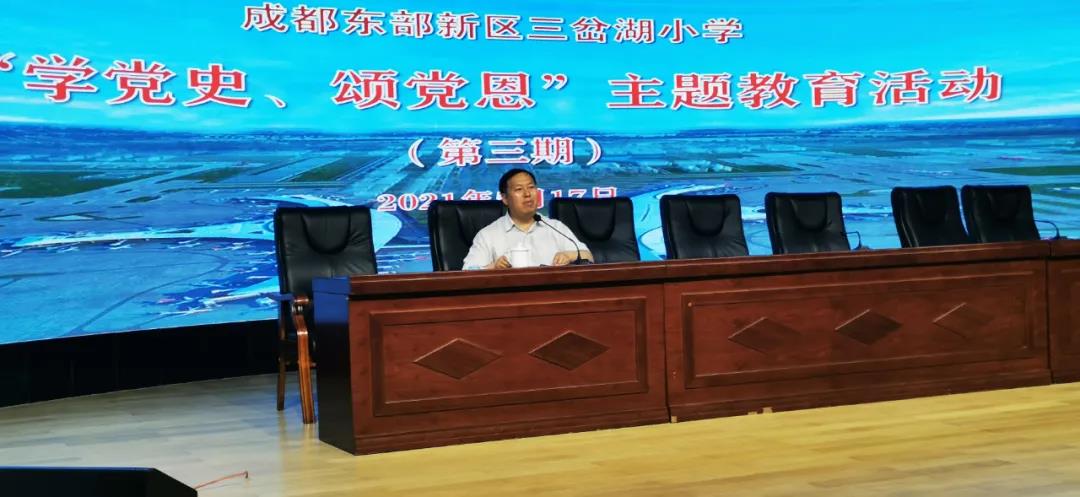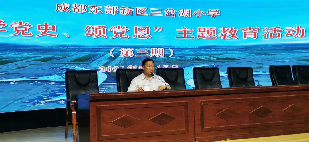 为进一步深入贯彻习近平总书记在党史学习教育动员会上的重要讲话精神,扎实开展党史学习教育,继承和发扬党的光荣传统和优良作风,努力建设一支“有理想信念、有道德情操、有扎实学识、有仁爱之心”的教师队伍,增强教师的荣誉感、责任感和使命感,5月17日下午,东部新区三岔湖小学党支部第三次邀请到中共成都市委党校党史党建教硏部安立伟教授为全体教师带来一场精彩的党史专题讲座。本次活动由办公室副主任林聪明主持。