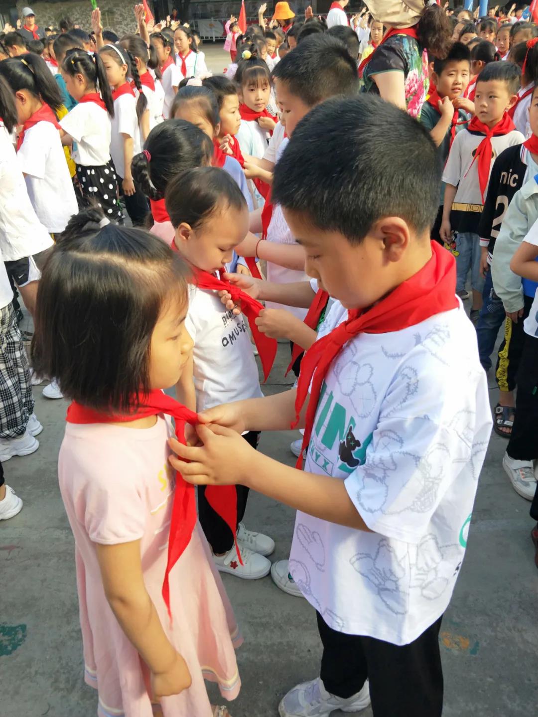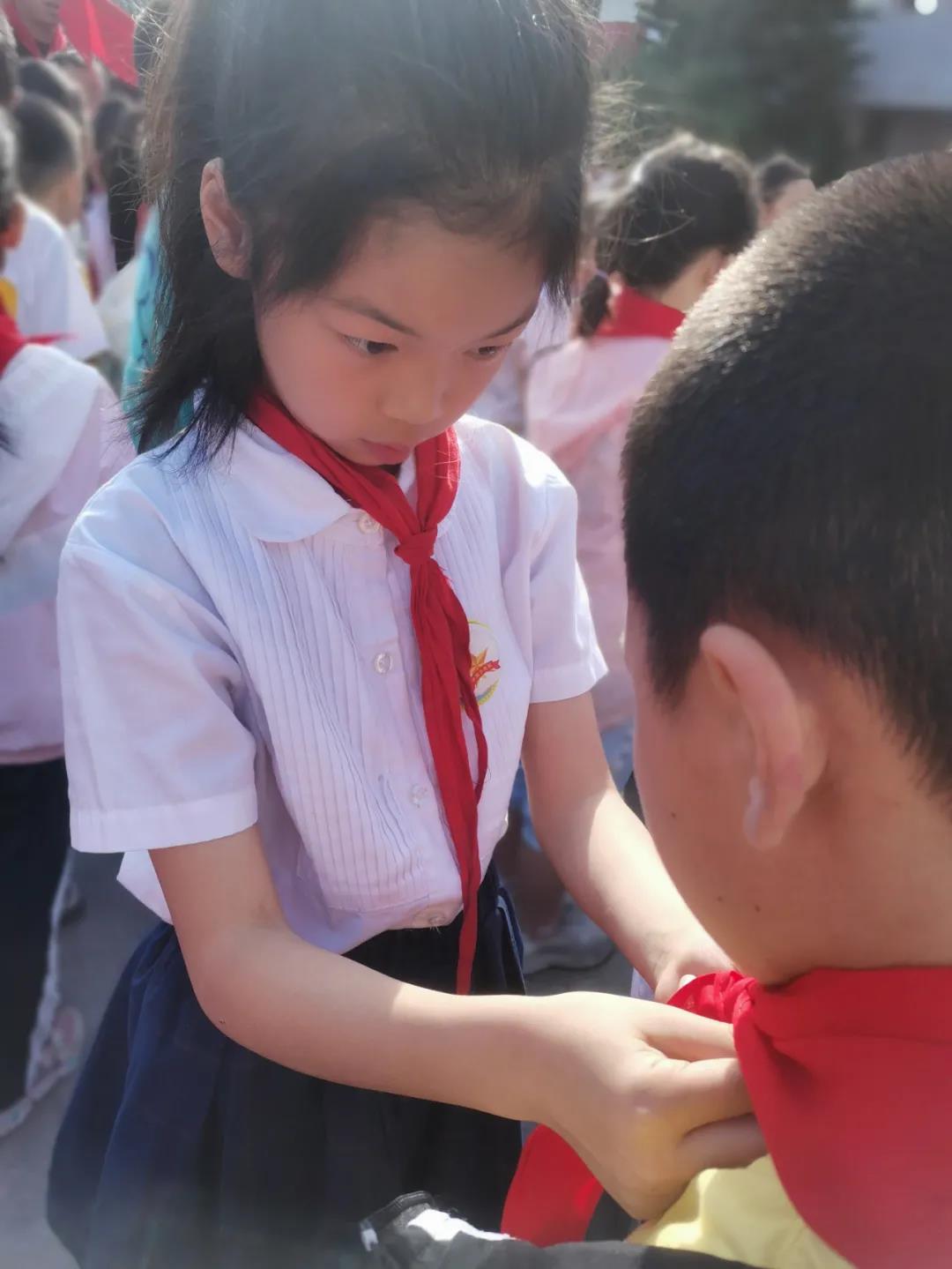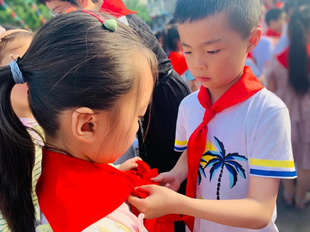 伴随着《中国少年先锋队队歌》乐曲,由二年级的老队员给新队员系上了鲜艳的红领巾,并由各中队辅导员为新队员颁发证书。此刻,孩子们稚嫩的脸上洋溢着自豪和喜悦。