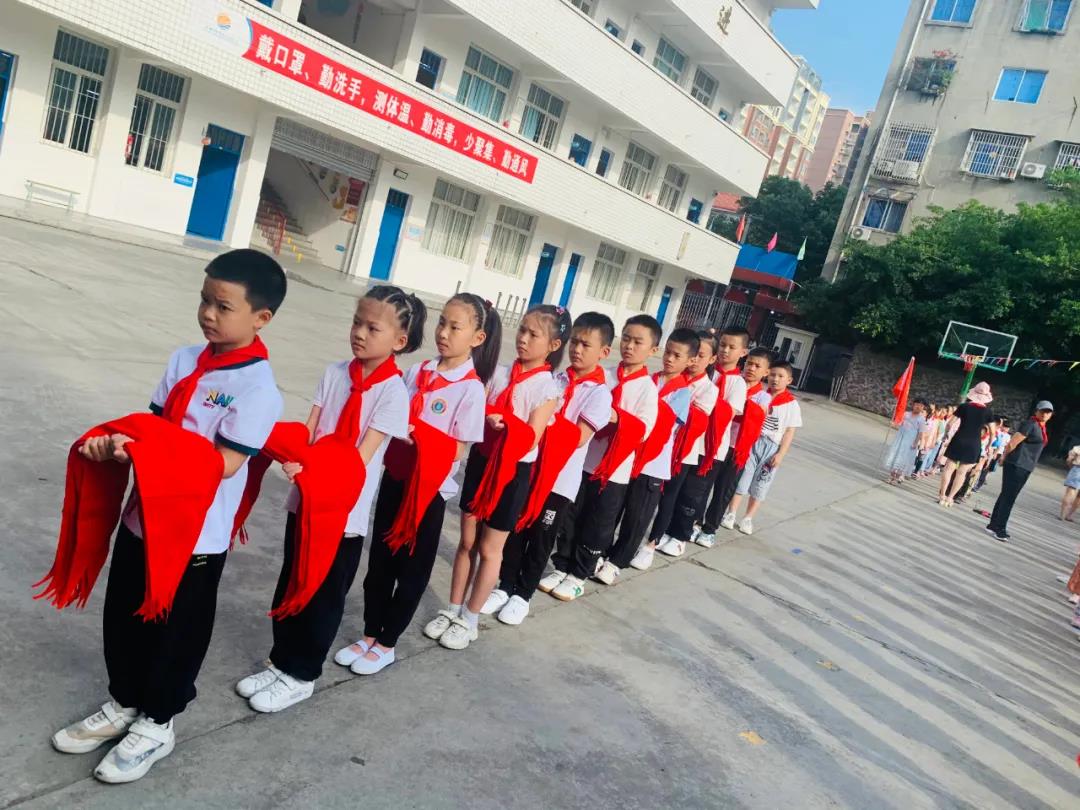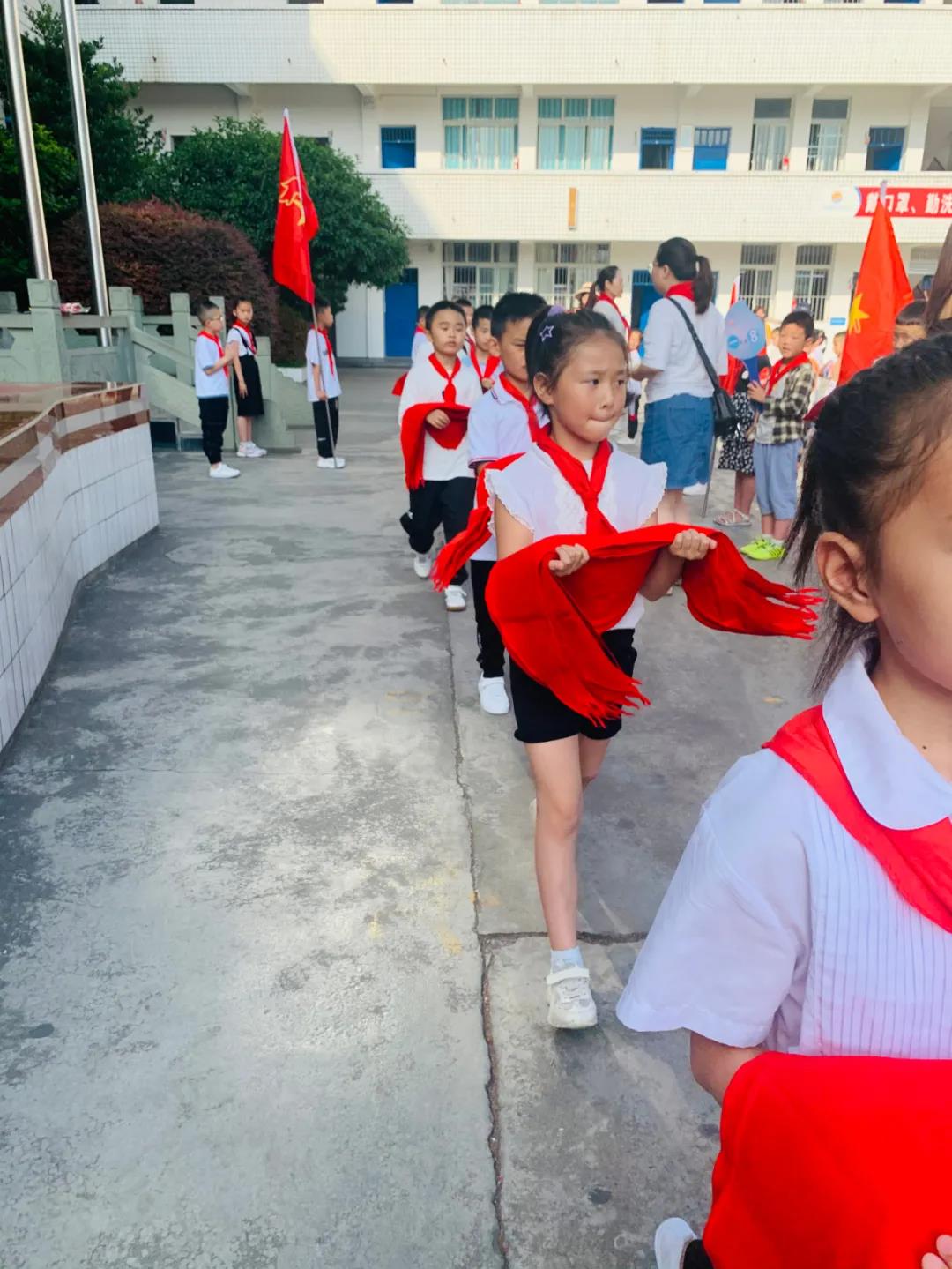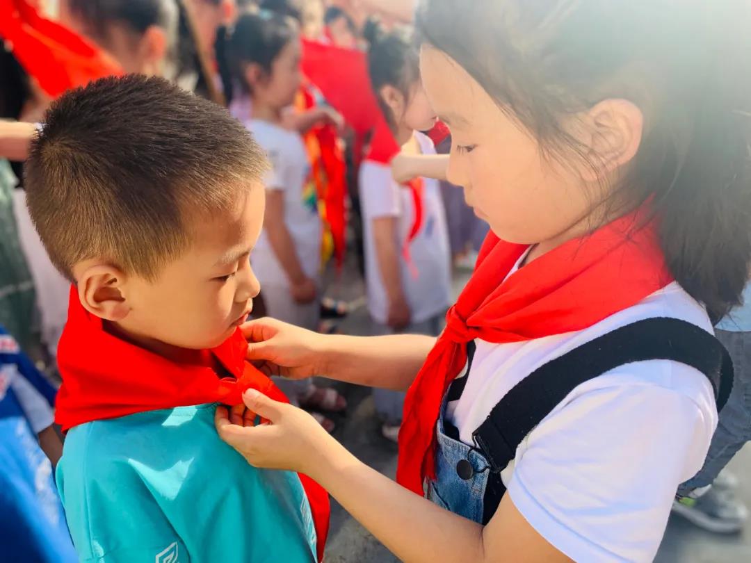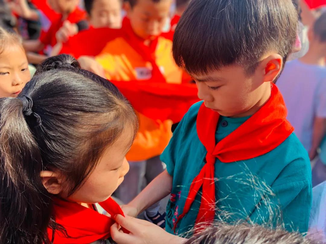 伴随着《中国少年先锋队队歌》乐曲,由二年级的老队员给新队员系上了鲜艳的红领巾,并由各中队辅导员为新队员颁发证书。此刻,孩子们稚嫩的脸上洋溢着自豪和喜悦。