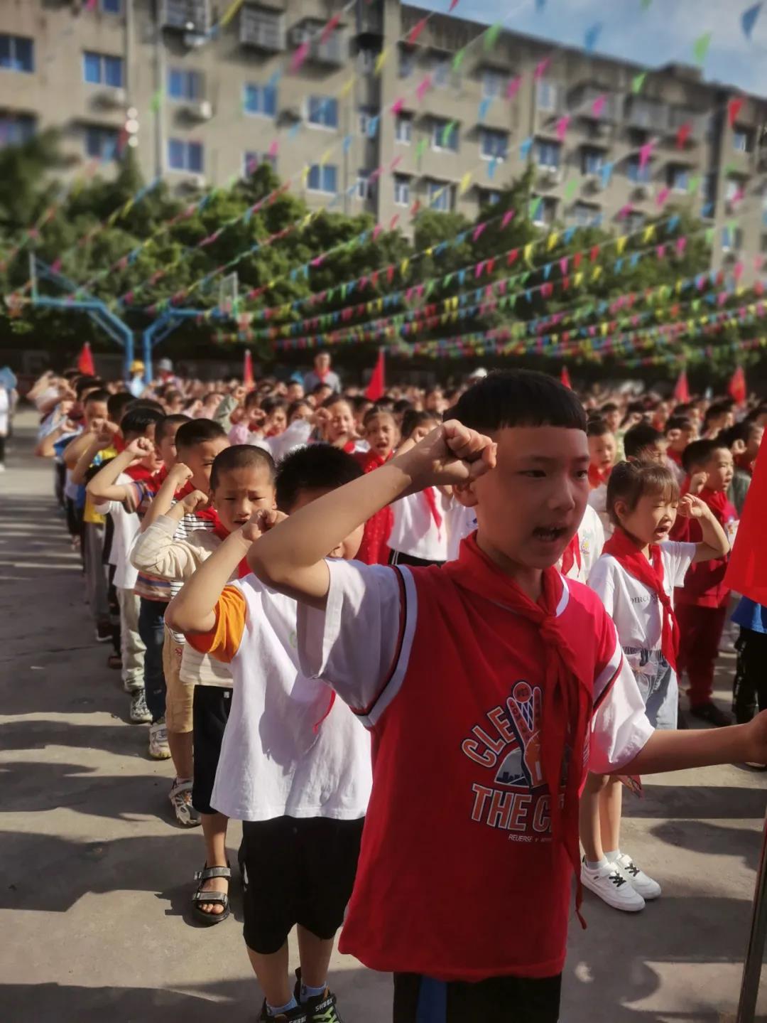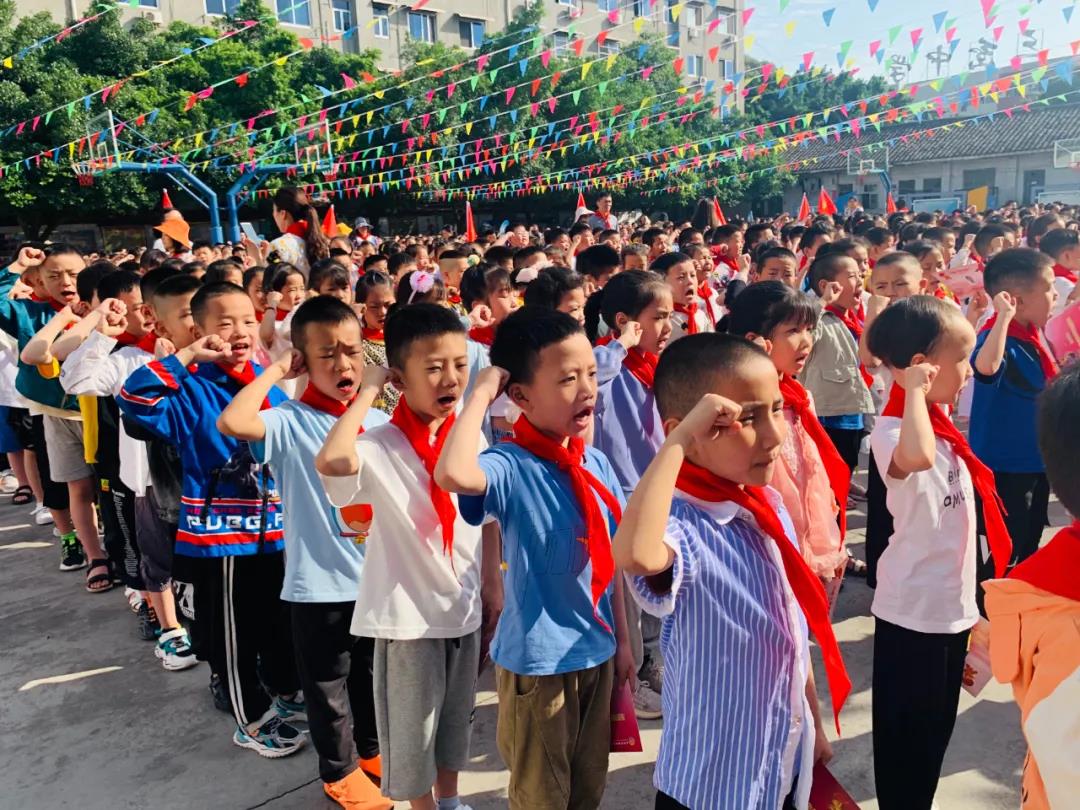在鲜艳的队旗下,少先队新队员们紧握着拳头,在大队辅导员周老师的带领下,面向队旗郑重宣誓“准备着,为共产主义事业贡献力量”,正式成为一名光荣的少先队员,给即将到来的六一儿童节,送上一份令自己感到无比自豪的礼物。