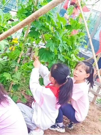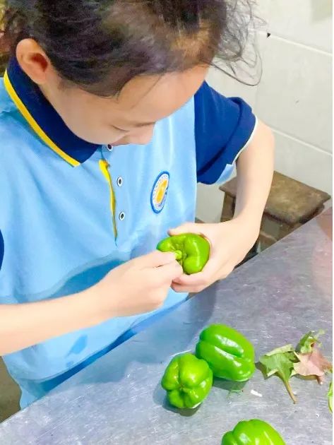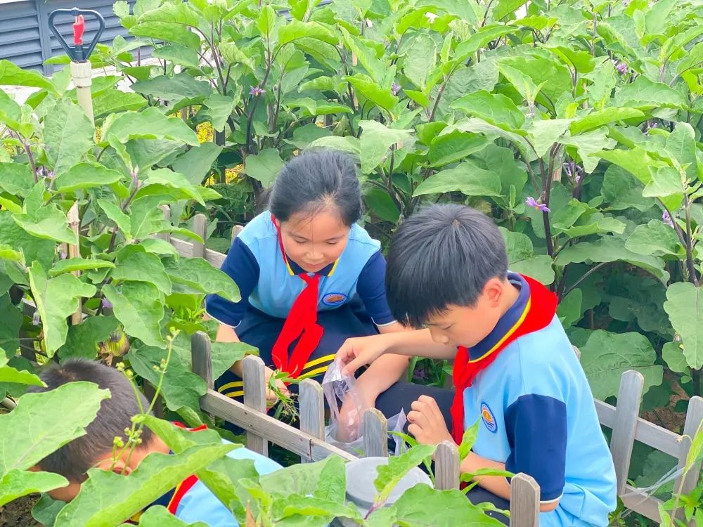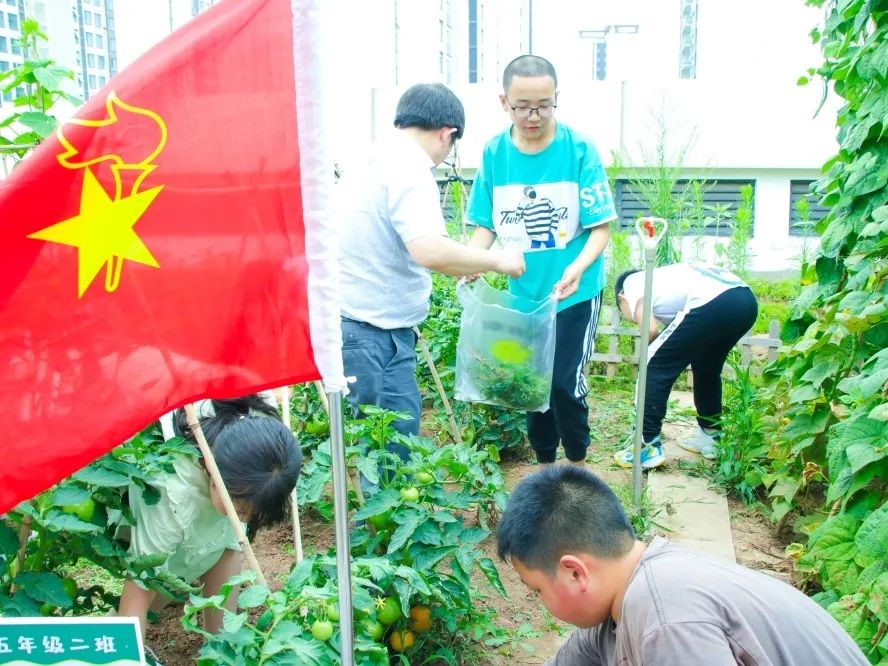 孩子们兴高彩烈地围着自己的菜地采摘茄子、青椒、西红柿......一派轻松欢乐的田园生活气息扑面而来。看着一个个诱人的果实,孩子们兴奋极了,都倍感自豪地说:“老师,瞧瞧,我们自己种的哟!”所有的班级都收获满满。