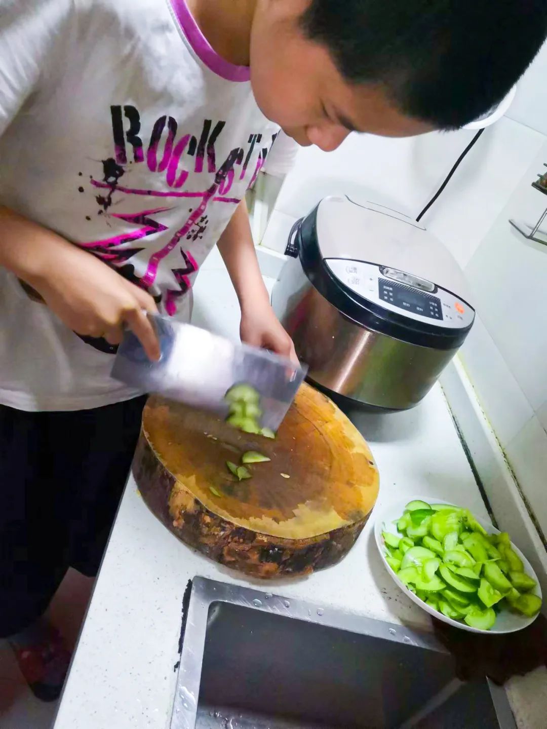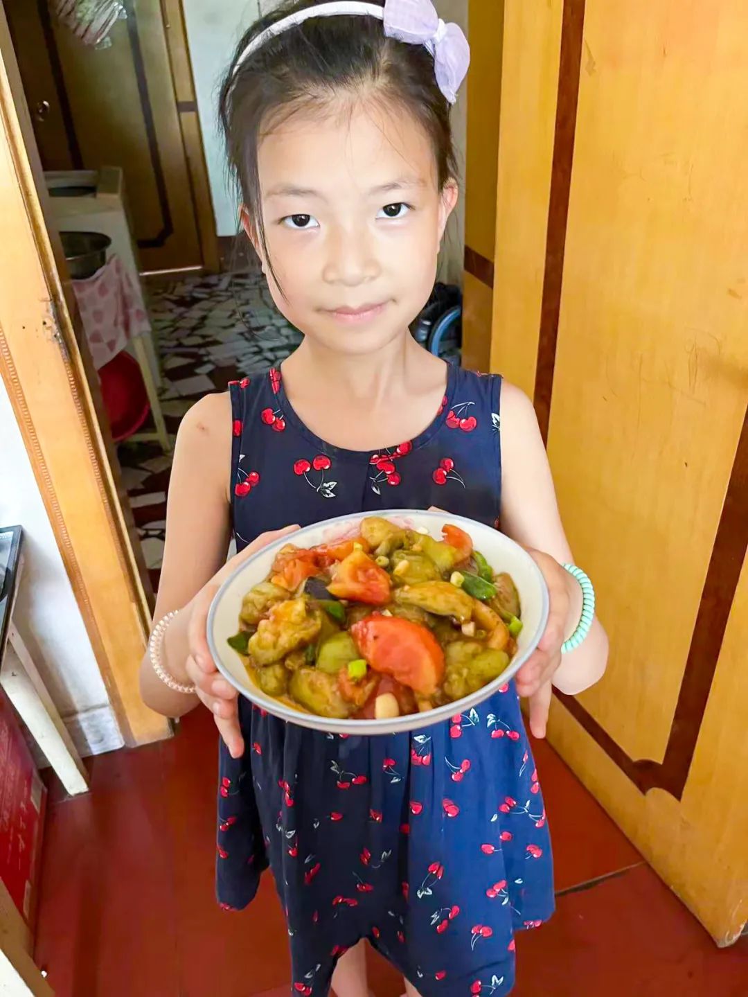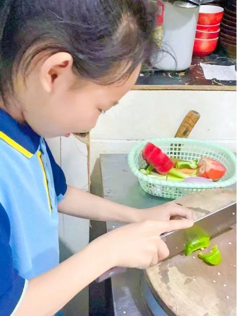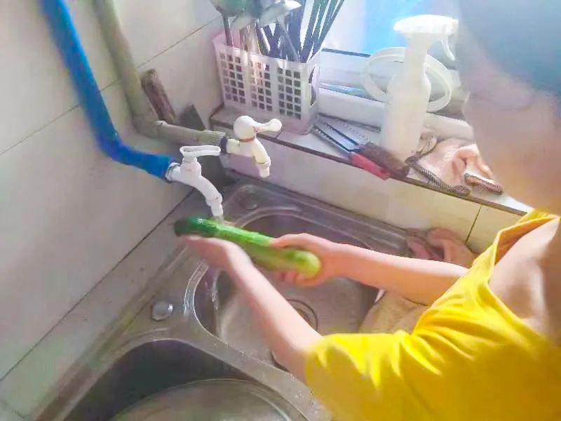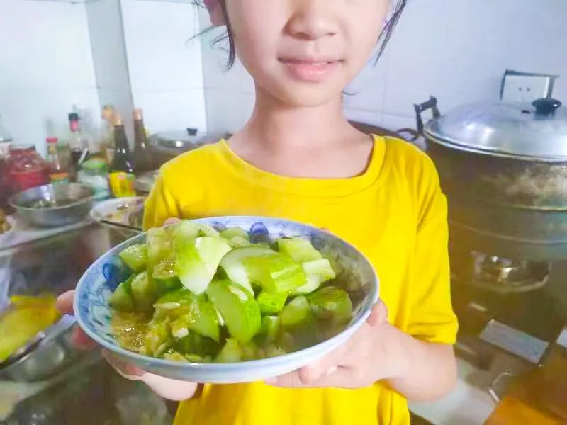 同学们把采摘的蔬菜带回家,展示他们做菜的功底,快看:有的同学正在切黄瓜,做了一盘拌黄瓜;还有青椒肉丝、素炒茄子...