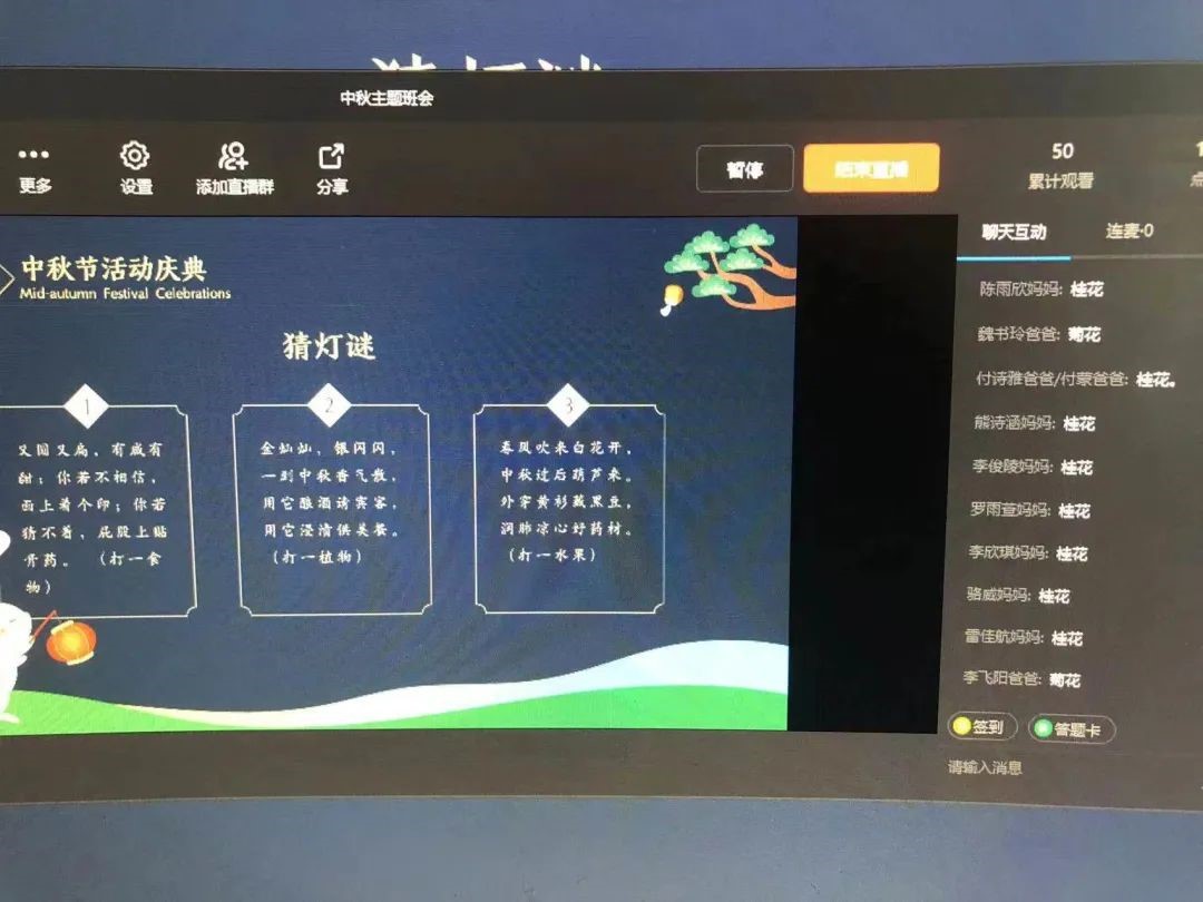 诗韵留香,诗香满园。学生们穿梭千年,回到昔日文人墨客的笔下,猜灯谜、诵古诗,品味了浓浓中秋情。