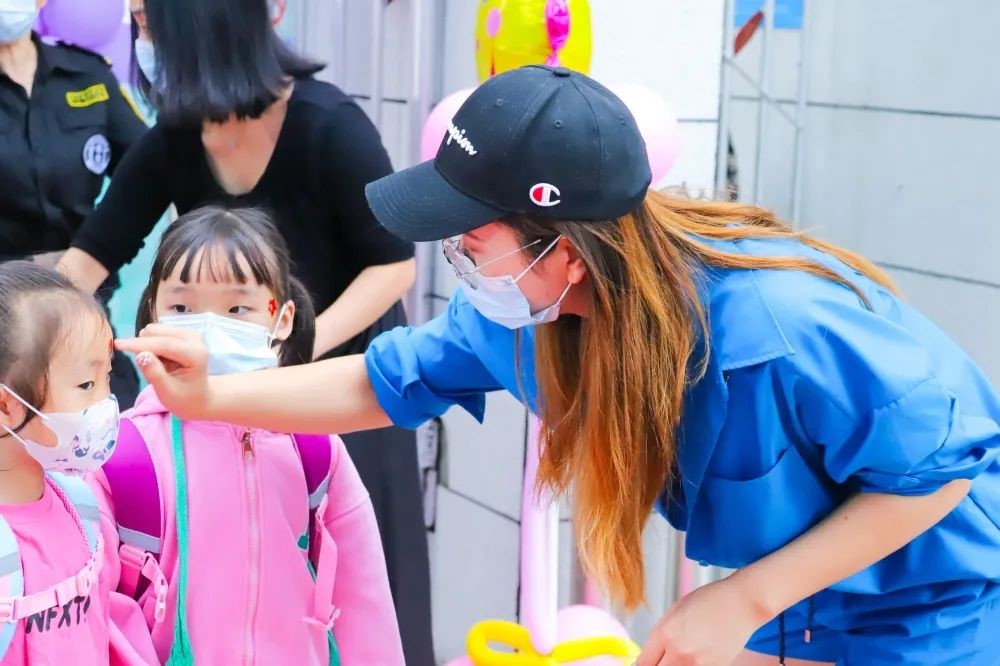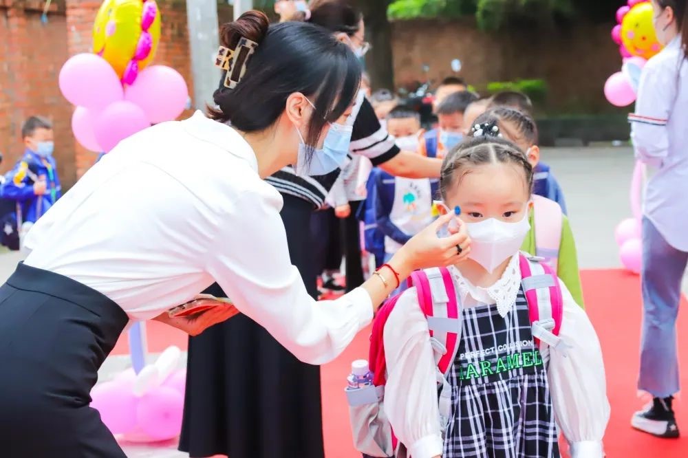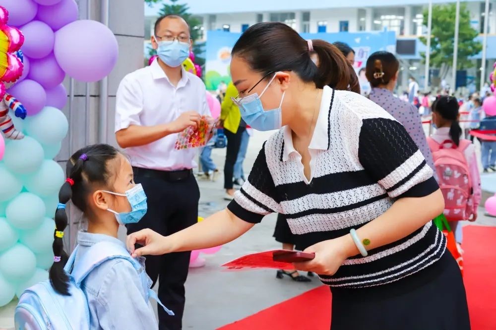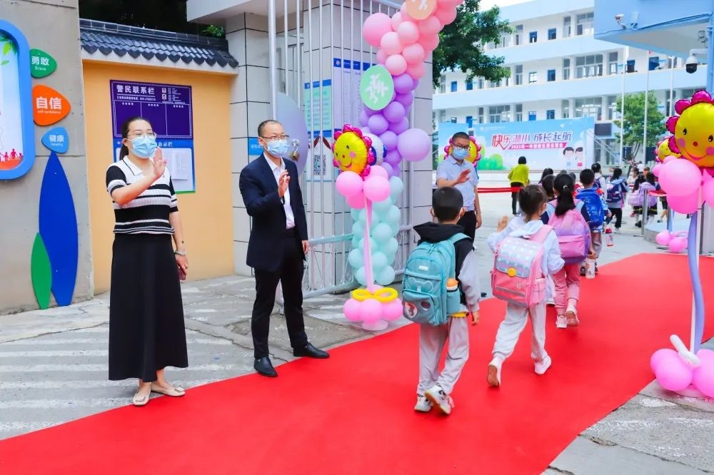 踏上鲜艳的红毯,迎接湖小娃们的是老师们灿烂的笑容;走进宽敞的校门,老师们亲切地在孩子们额头上贴上一张张笑脸。在一声声亲切的问候和一张张笑脸的迎接下,湖小娃们满怀憧憬地步入校园,开启他们期盼已久的小学生活。