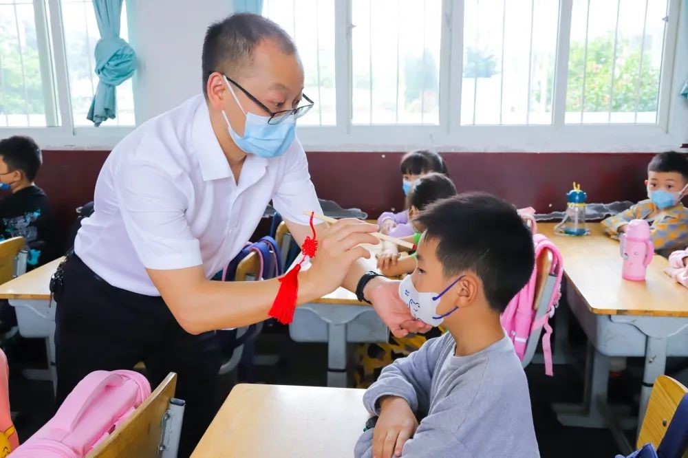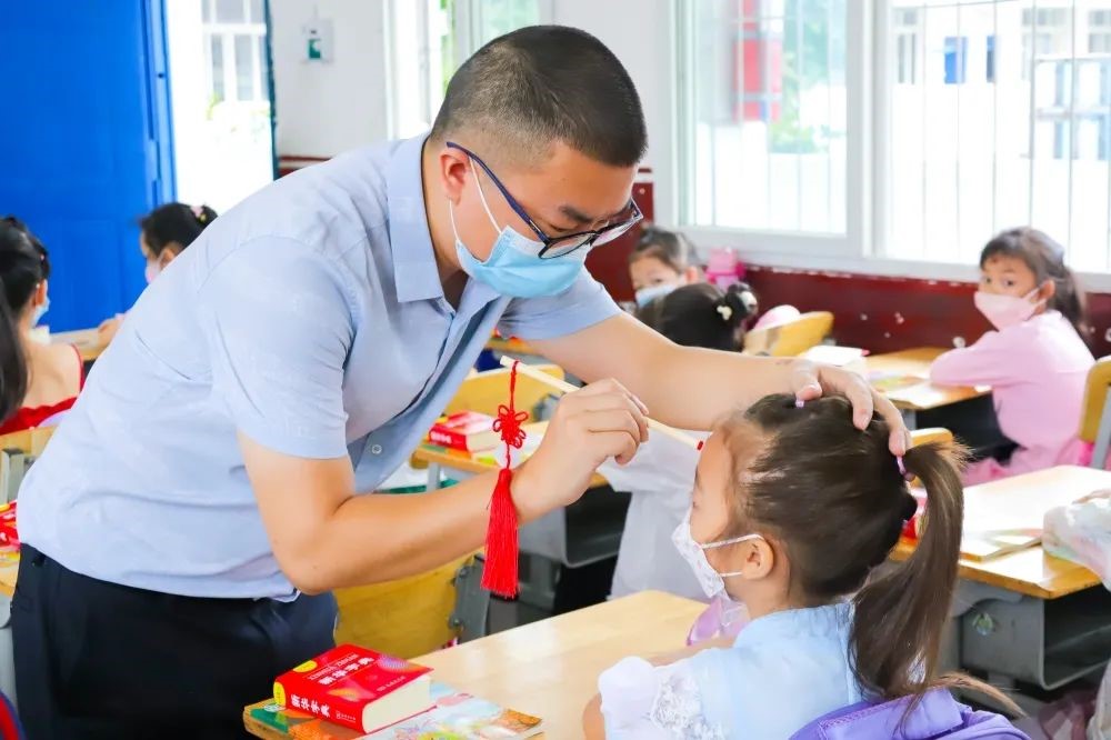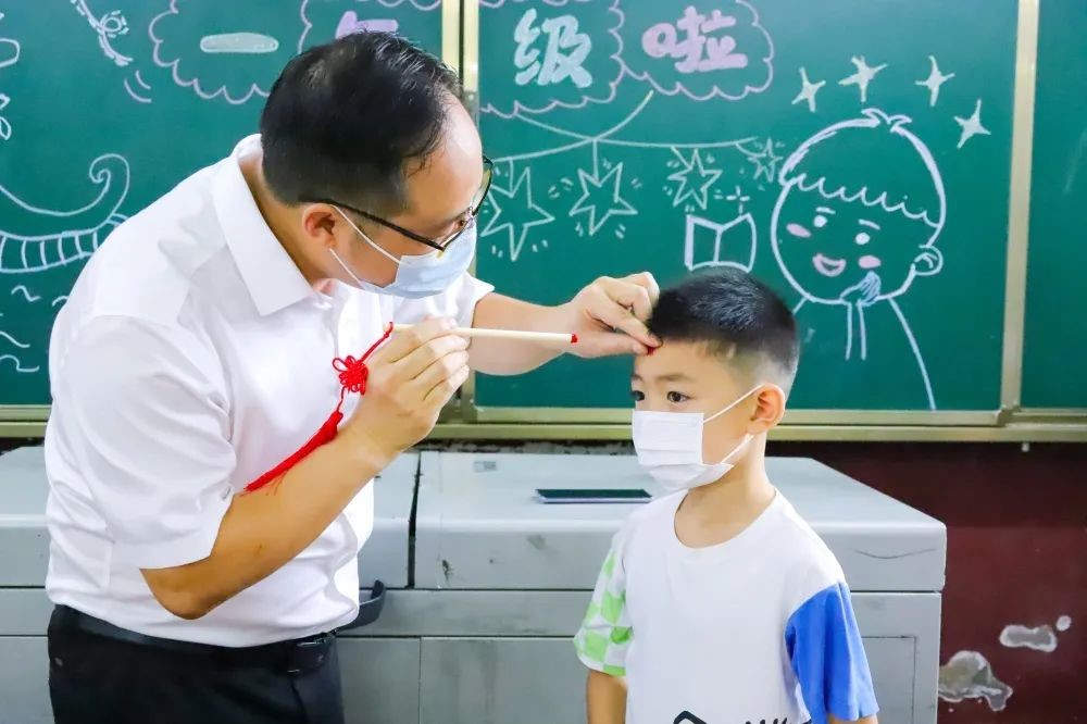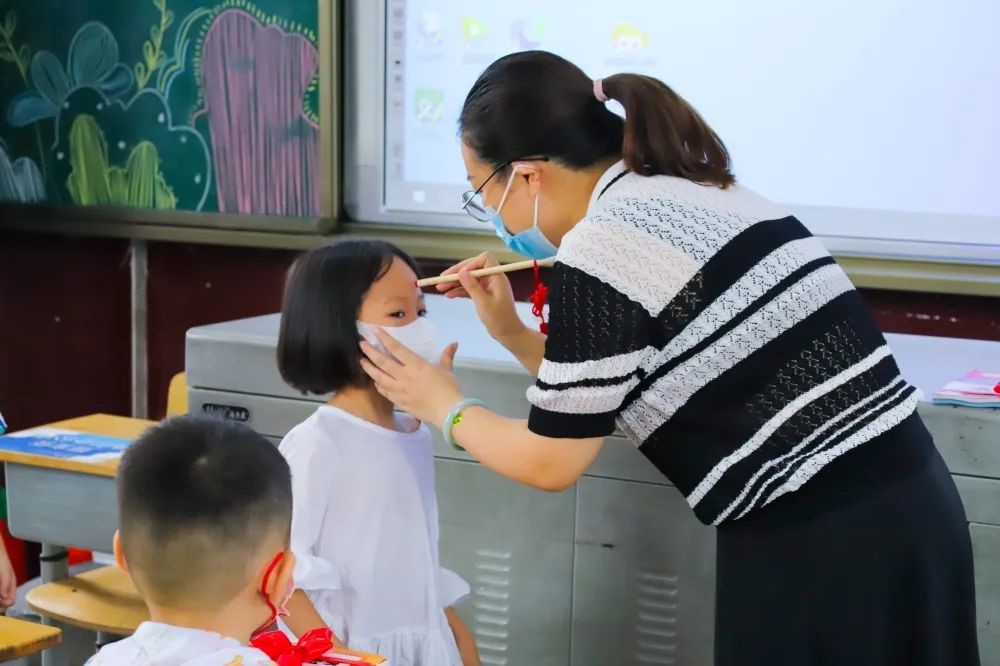 在古代,点朱砂又称“开天眼”,意思是开启智慧,寓意从此眼明心亮,发奋读书。老师们把鲜红的朱砂点在湖小娃们的额头正中间,正是把殷切期望送给每一个湖小娃,祝福湖小娃们在未来的航行中一帆风顺,读好书,好读书,成为一个有智慧的人。