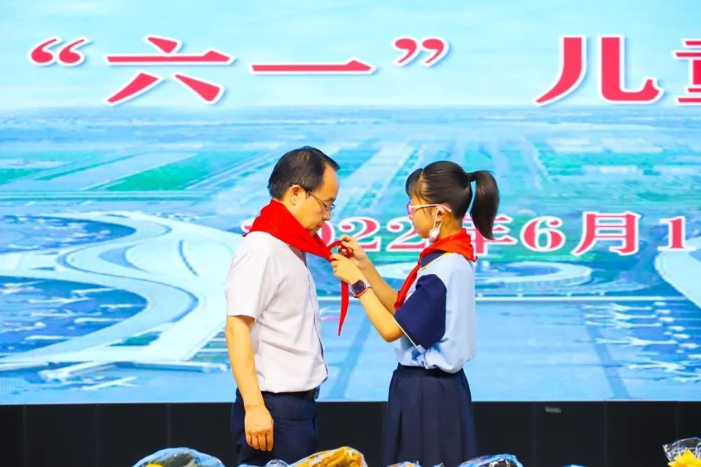慰问活动开始之前,学生代表向领导佩戴领巾,邀请领导与同学们一起欢度“六一”儿童节,庄重的队礼表达了孩子们对党和政府,对领导的感恩之情。