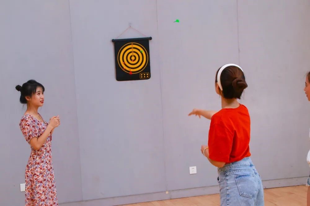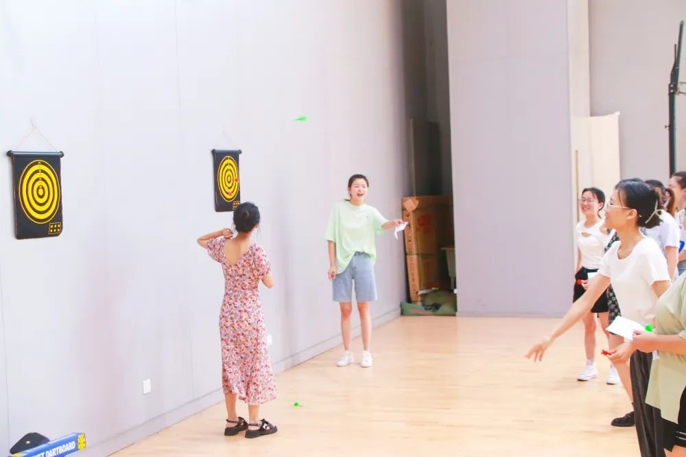 本次游园活动以积分赛的方式进行,内容新颖,形式有趣,设置了你丢我接球、掷飞镖、你比我猜、套圈、蒙眼击鼓等5个项目。