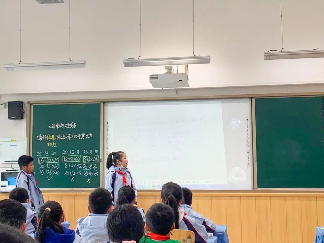 第二节课是李玲娟老师执教的《三角形的三边关系》。课前,李老师精心制作预学指导单,有效指导学生发现了三角形的三边关系;课中,李老师紧紧抓住理解概念中的“任意”、优化为“较短两条边大于第三边”、第三边取值范围等引导学生层层深入理解三角形三边关系,并运用三角形三边关系解决生活中的实际问题。学生在自主探究、合作交流中提升了数学学科素养。